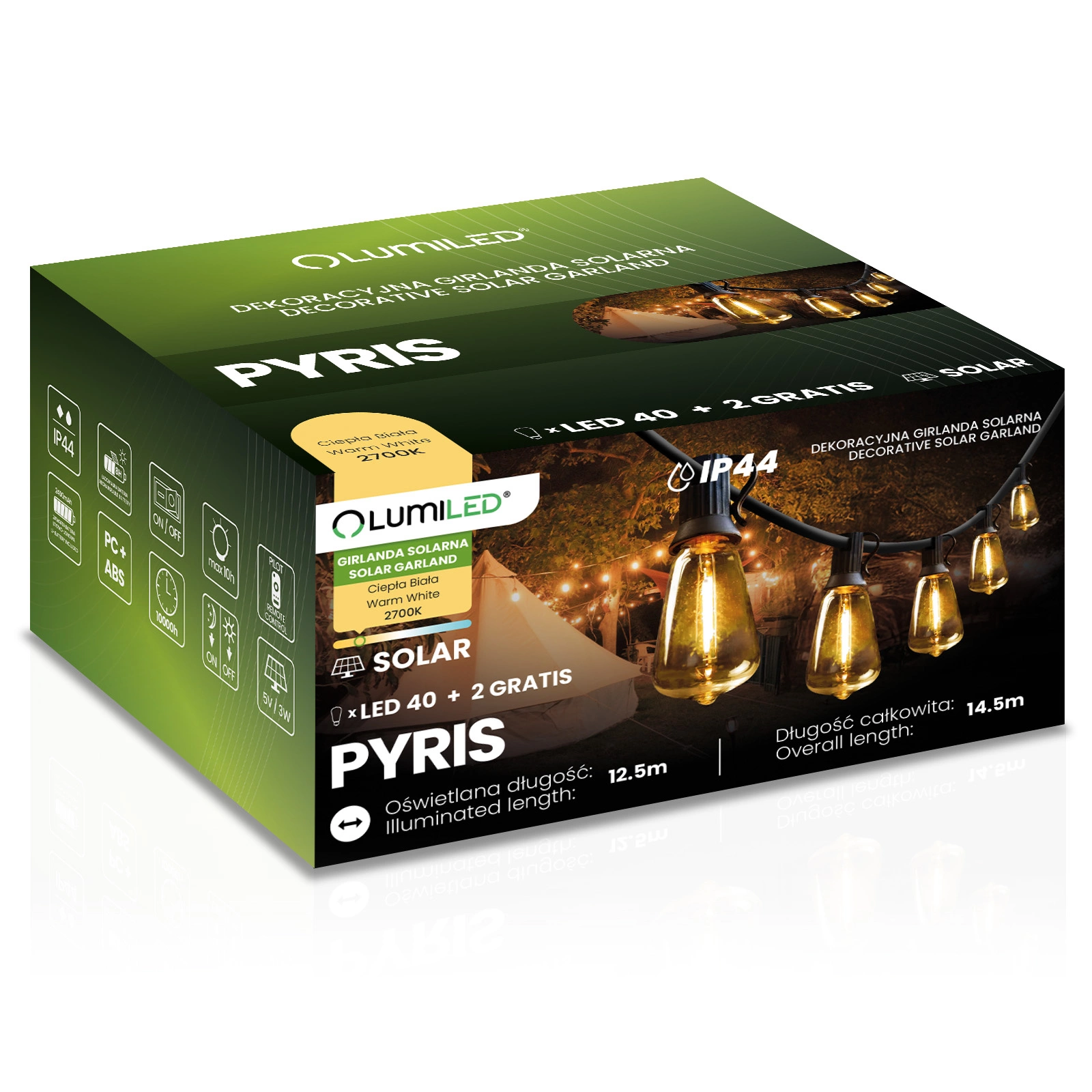 Solar Garten Girlande 40x LED Dekobirnen 14,5m 2700K Warm + PYRIS LUMILED Fernbedienung (1 stk.)