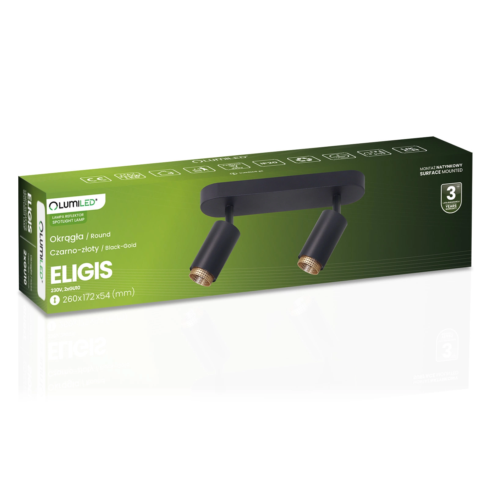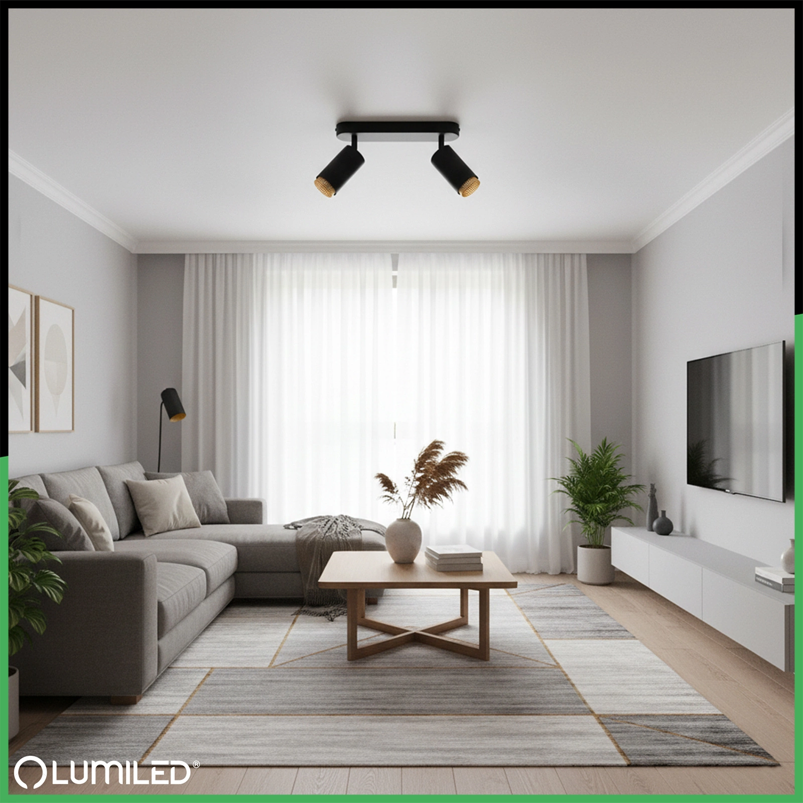 Deckenleuchte der Serie ELIGIS von Lumiled in Schwarz und Gold ist eine elegante und funktionelle Lösung für moderne Innenräume. Es ist aus hochwertigem Aluminium gefertigt und verbindet Langlebigkeit mit einem ästhetischen Erscheinungsbild. Das vorgestellte Modell ist ausgestattet mit gU10-Glühlampenfassung, positioniert in stilvollem goldenen Lampenelement, was der Leuchte einen minimalistischen, aber raffinierten Charakter verleiht. Ein weiterer Vorteil der Leuchte ist die Möglichkeit, jede Glühbirne mit einem GU10-Gewinde mit einer maximalen Leistung von 12 W zu montieren.