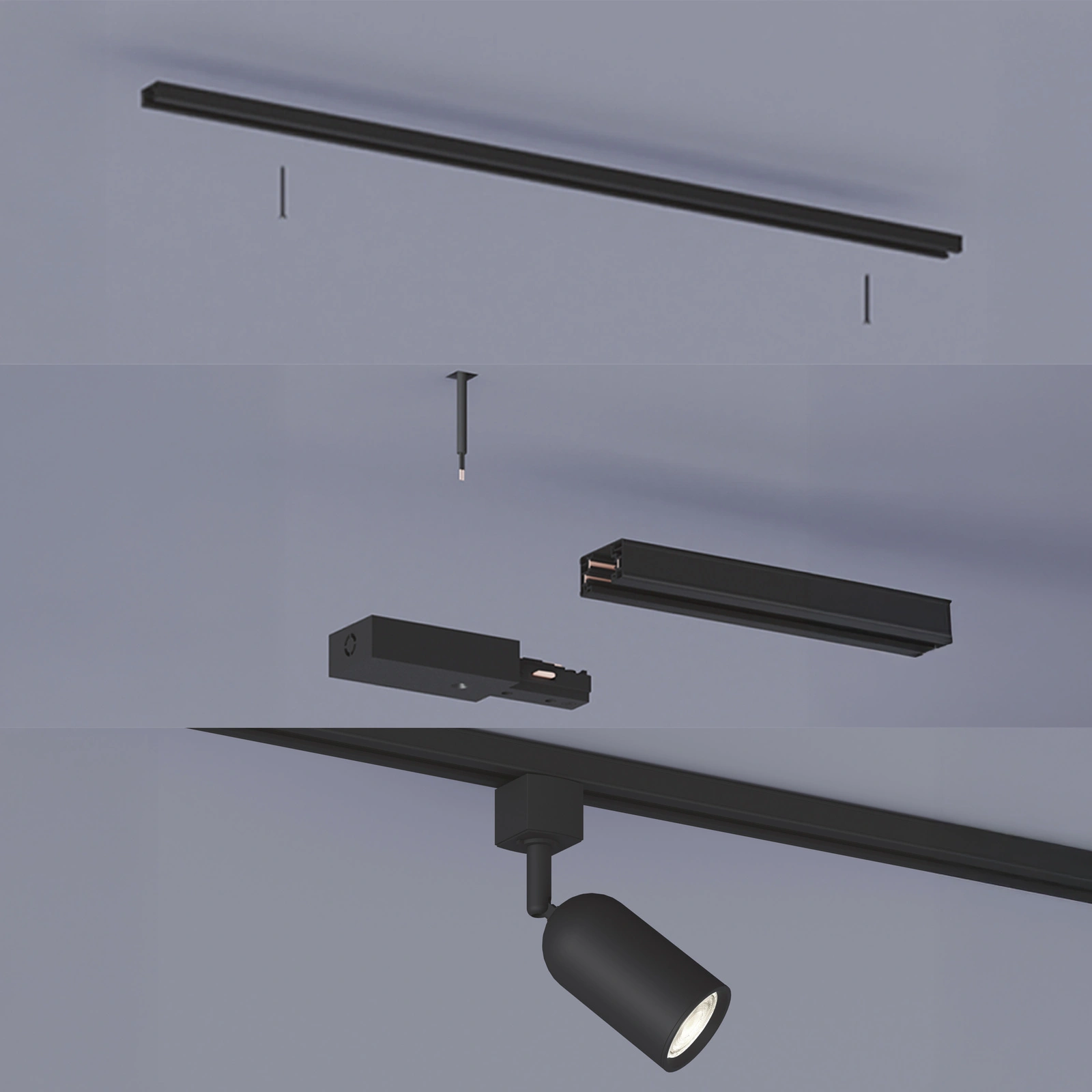 Dank seines durchdachten Designs ist die Installation einfach und intuitiv, die Schienenverbindung bleibt stabil und ästhetisch. Der Schalter ermöglicht eine flexible Systemerweiterung ohne Eingriff in die bestehende Installation. Das schwarze Gehäuse verleiht dem gesamten System einen modernen, unverwechselbaren Charakter und fügt sich perfekt in minimalistische Einrichtungen ein.