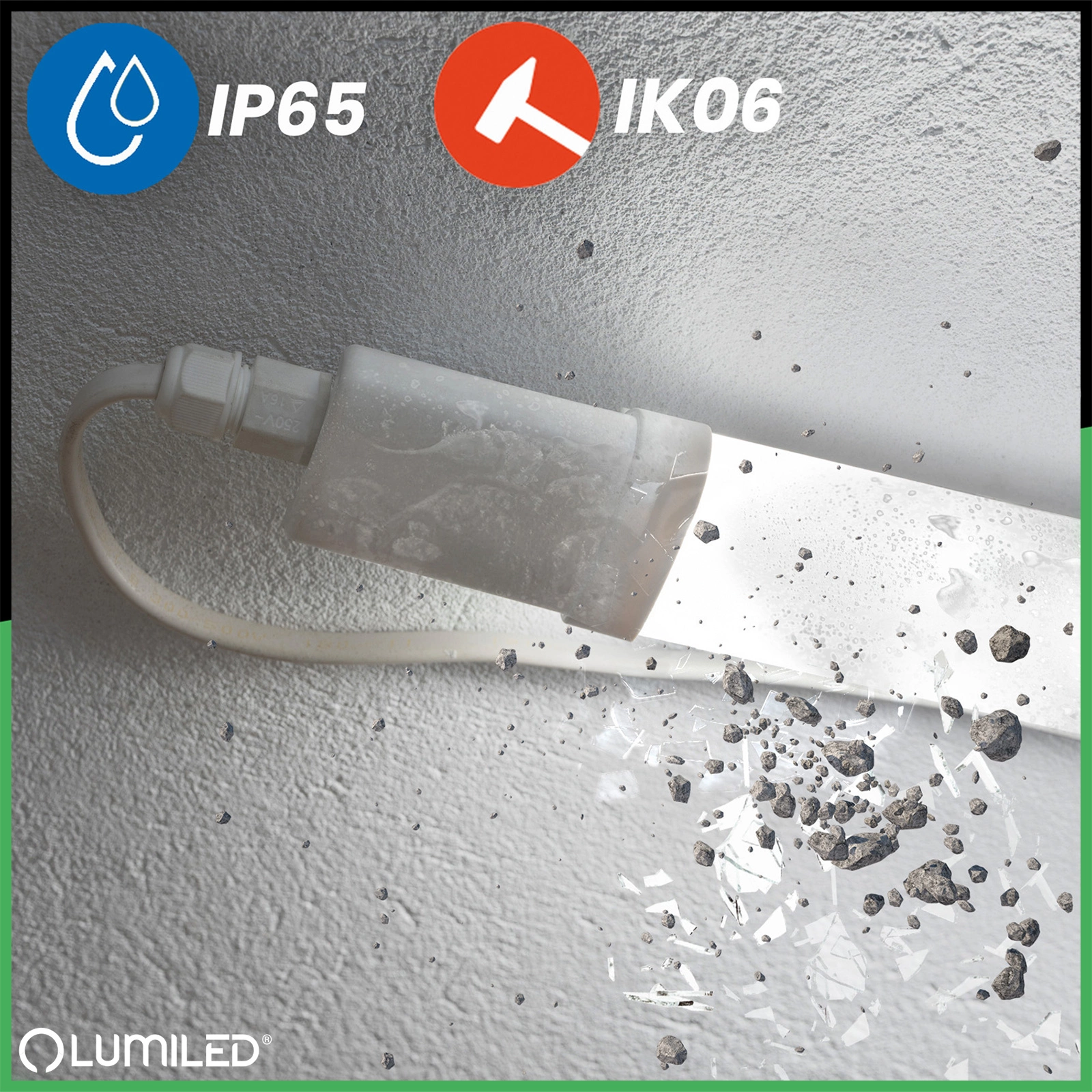 Die 36W-Lampe wurde für extreme Bedingungen entwickelt - die IP65-Versiegelung schützt das Innere der Leuchte vor Wasser, Feuchtigkeit, Staub und Schmutz. Dies macht die Leuchte ideal für Werkstätten, Autowaschanlagen, Heizungsräume oder überdachte Parkplätze. Die robuste Kunststoffkonstruktion sorgt nicht nur für mechanische Beständigkeit - IK06 - sondern auch für eine effektive Wärmeableitung. Dies gewährleistet einen stabilen Betrieb das ganze Jahr über - unabhängig von den Umgebungsbedingungen.
