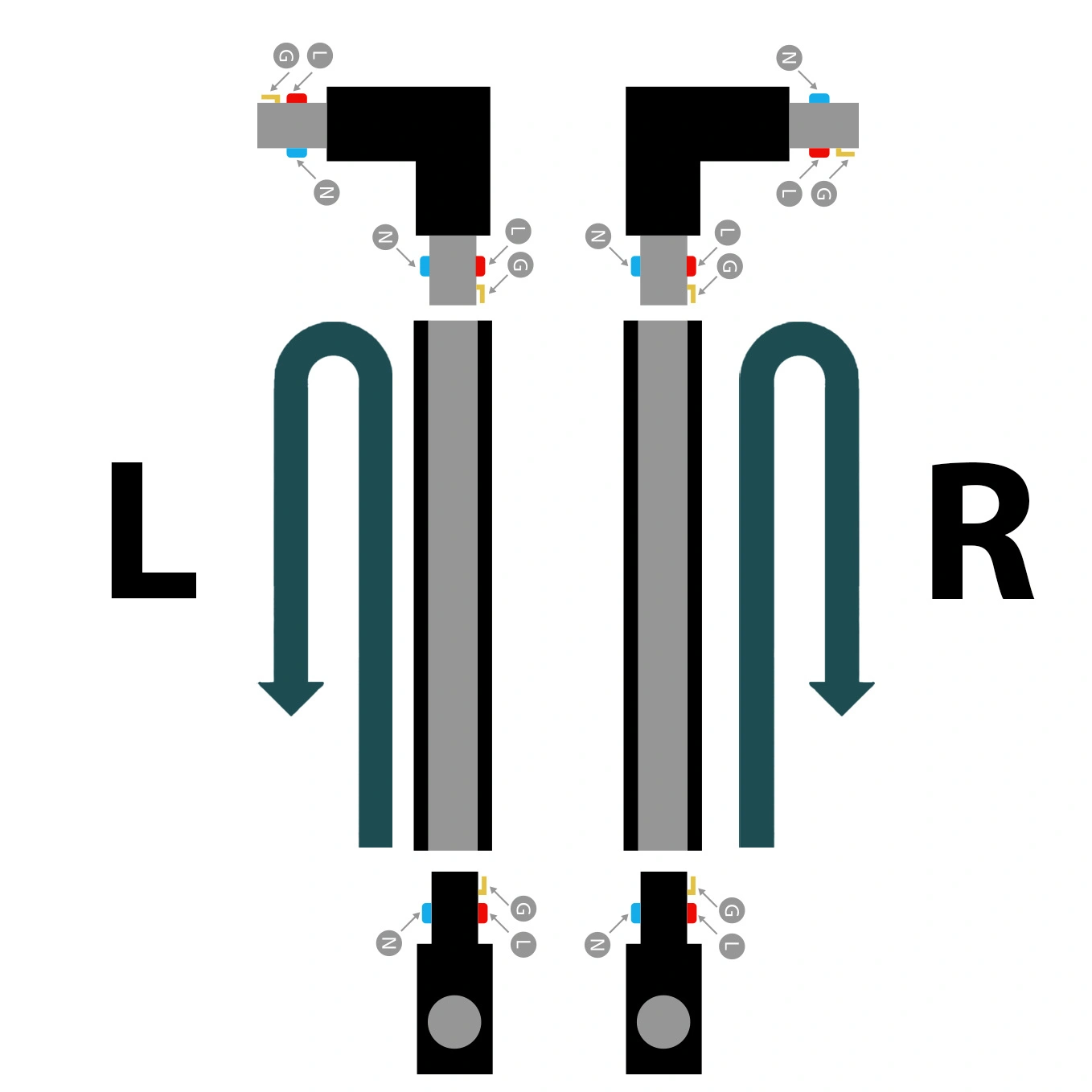 Wenn die zweite Schiene nach links führen soll, wählen Sie ein linkes Verbindungsstück (L). Soll sie nach rechts führen, ist eine rechtsseitige Kupplung (R) angebracht.