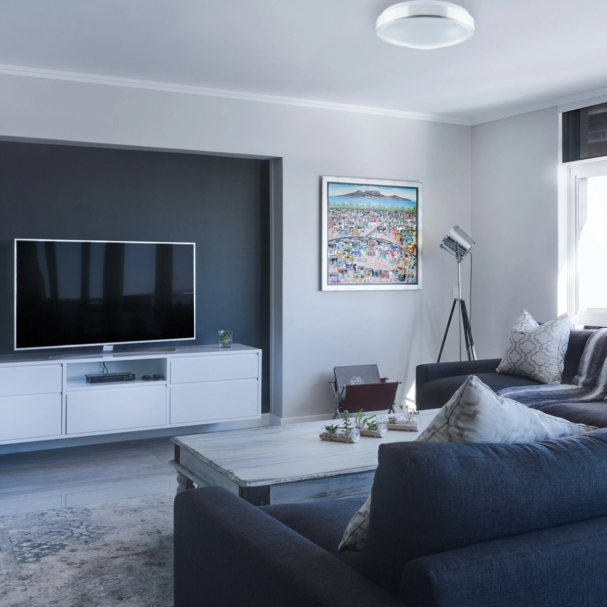 Runde, moderne LED-Wand- und Deckenleuchte, weiß mit Chromleiste . Die Deckenleuchte ist aus hochwertigen Materialien gefertigt und zeichnet sich durch hohe Langlebigkeit und Liebe zum kleinsten Detail aus. Der Sockel und das Gehäuse bestehen aus Stahl , der Lampenschirm aus Kunststoff.