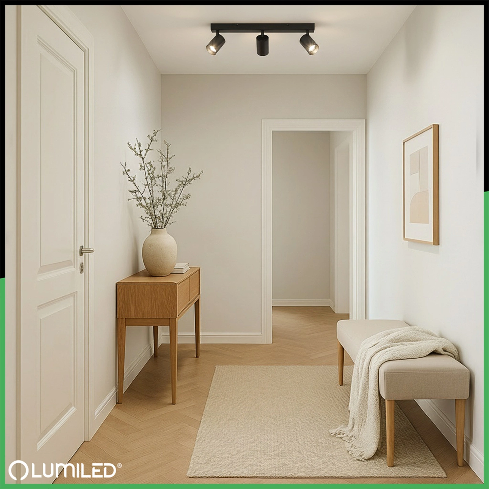 Die röhrenförmige Deckenleuchte mit modernem und minimalistischem Design ist die perfekte Lösung für jede Art von Einrichtung. Der schwarze Reflektor ist mit drei Fassungen für GU10-Glühbirnen ausgestattet, so dass sowohl herkömmliche als auch energiesparende LED-Lampen verwendet werden können. Der verstellbare Lichteinfallswinkel ermöglicht eine präzise Ausleuchtung ausgewählter Punkte im Raum. Das schlichte Design und die dezente matte Oberfläche machen die Leuchte zu einer perfekten Ergänzung für moderne, skandinavische oder Loft-Stil-Einrichtungen. Sie eignet sich perfekt zur Akzentuierung von Bildern, Regalen oder dekorativen Elementen und kann auch als größeres Beleuchtungssystem eingesetzt werden.