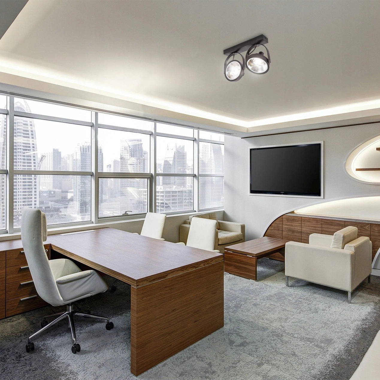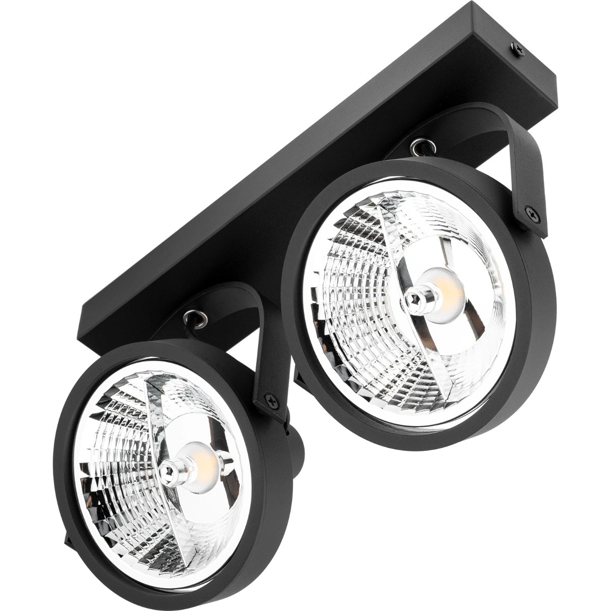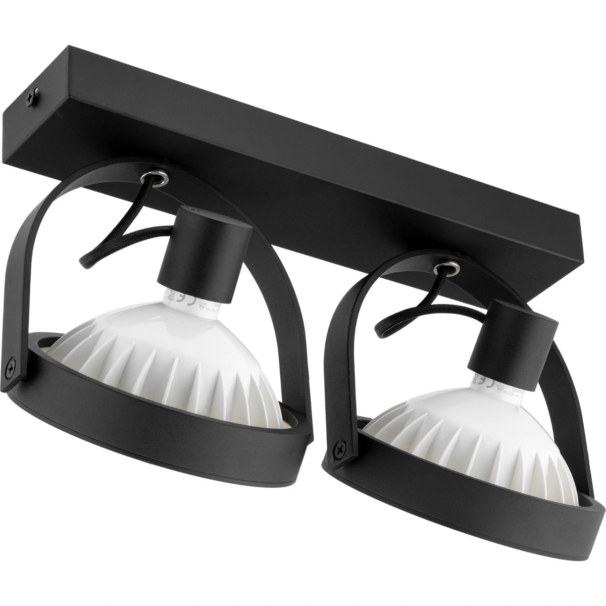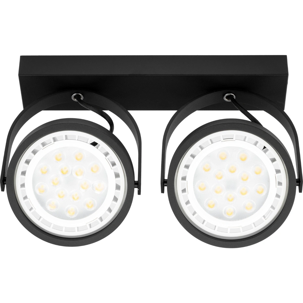 Schwarze Deckenleuchte mit austauschbarem Leuchtmittel mit zwei GU10- Fassungen . Die Lampe mit ES111-Glühbirnen mit engem Abstrahlwinkel eignet sich perfekt für die Beleuchtung von Orten wie einem Büro, einem Flur oder einem Schaufenster.