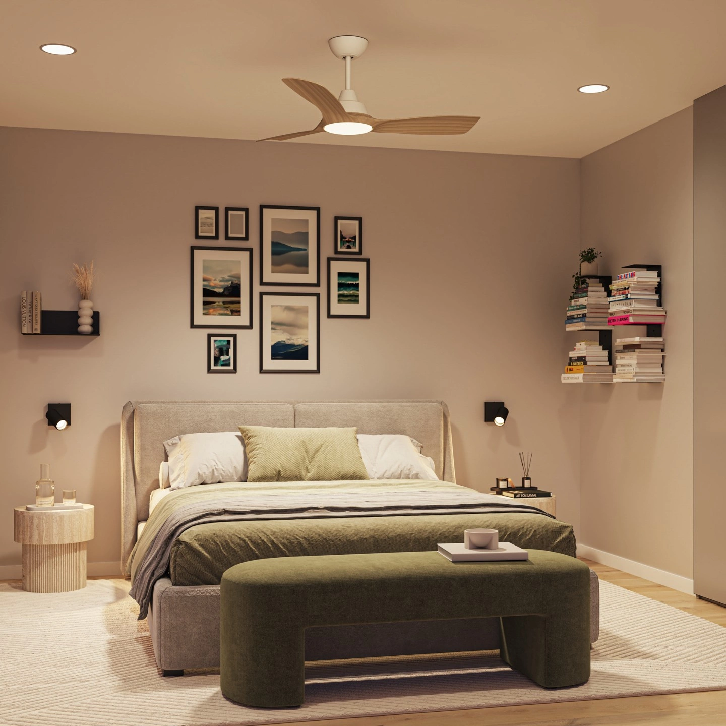Die Olas Fan Lamp bietet eine gleichmäßige und starke Beleuchtung, die den gesamten Raum perfekt ausleuchtet, ohne zu blenden. Modernste LED-Technologie garantiert ein sauberes, stabiles Licht, das sich ideal für die täglichen Aktivitäten im Haus eignet. Dank der präzisen Optik und der hochwertigen LEDs bietet die Leuchte eine effiziente und energiesparende Beleuchtung bei gleichzeitigem Komfort für die Augen. Über eine Fernbedienung oder einen Schalter lässt sich die Helligkeit leicht an die jeweiligen Bedürfnisse anpassen.