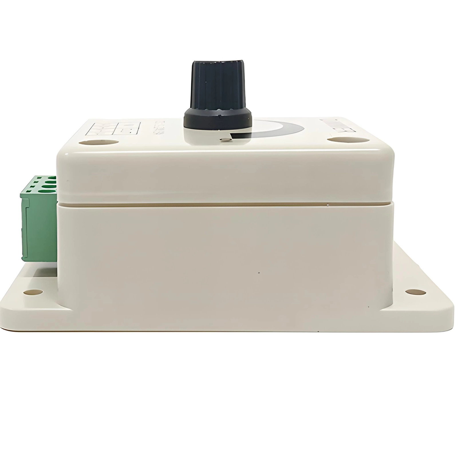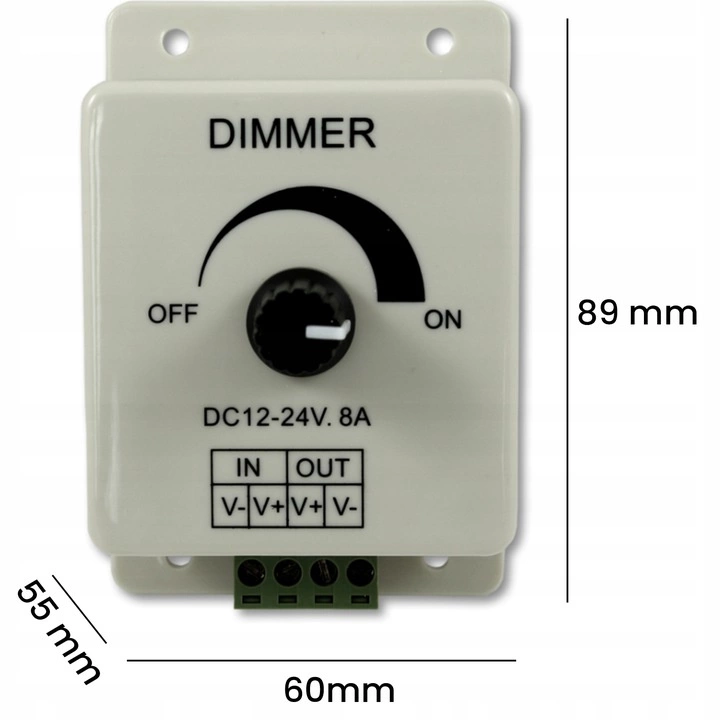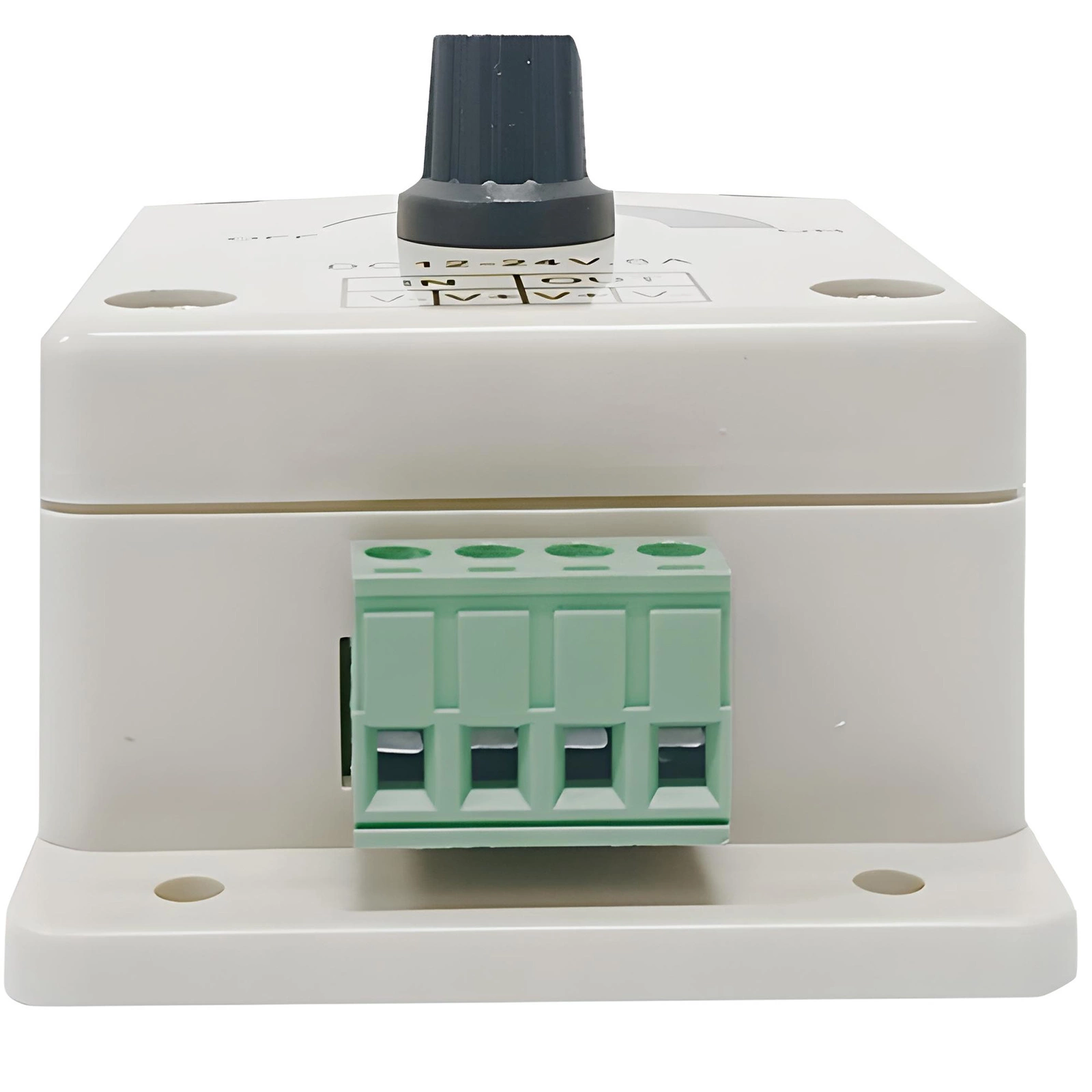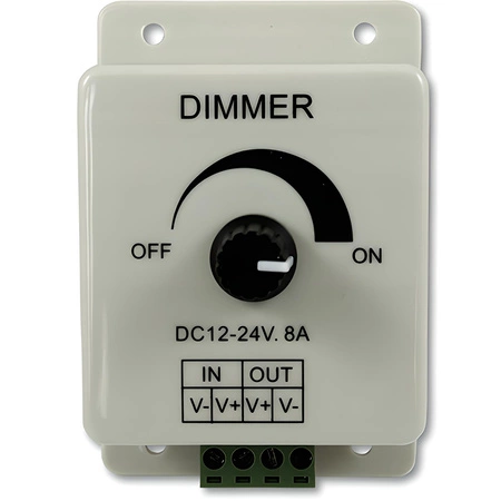 Der vorgestellte 8A 12V LED-Dimmer ist für einfarbige LED-Streifen gedacht. Mit dem Knopf im mittleren Teil des Controllers kann die Lichthelligkeit unabhängig eingestellt werden . Der Hauptvorteil dieses Dimmers ist die hohe Qualität der Materialien, aus denen er hergestellt ist. Dank der soliden Bauweise können wir einen störungsfreien Betrieb gewährleisten.