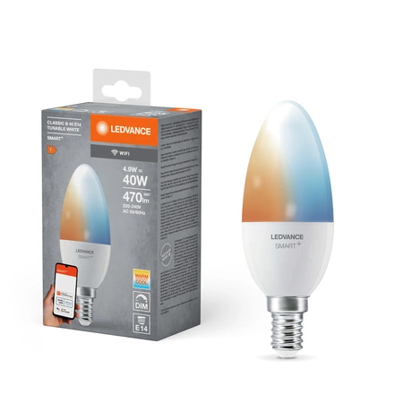 Entdecken Sie eine neue Qualität der Beleuchtung mit der intelligenten LED-Glühbirne Ledvance in Kerzenform E14. Mit einer Leistung von 4,9 W sorgt sie für Energieeinsparungen und erzeugt einen Lichtstrom von 470 lm. Genießen Sie die Möglichkeit, die Lichtfarbe(CCT) zu ändern und den Komfort der WiFi-Dimmfunktion, um die Beleuchtung an jede Situation anzupassen.