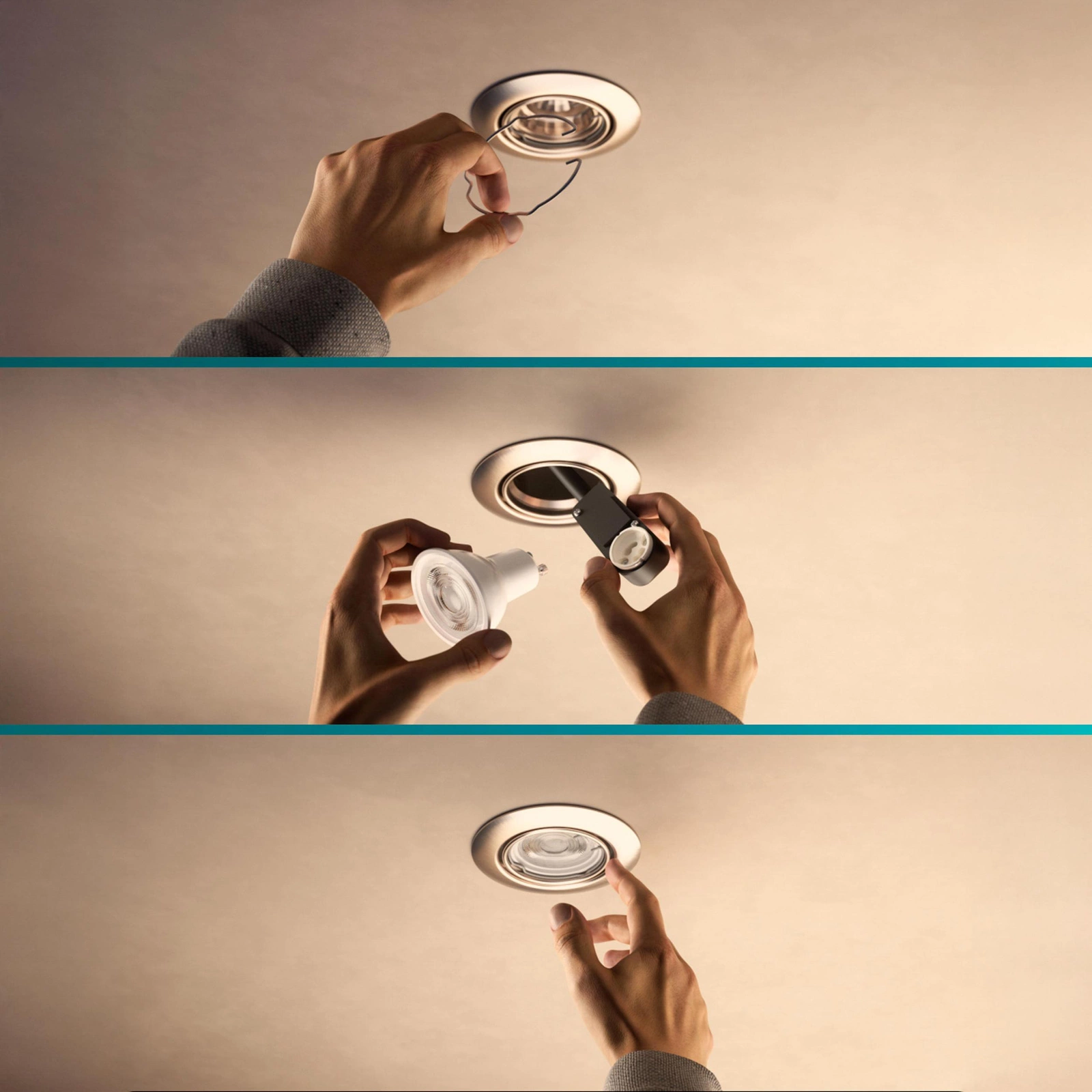 Noch nie war das Auswechseln einer Glühbirne so einfach. Dank der ausgeklügelten Konstruktion der Leuchte können Sie dies selbst vornehmen, ohne die Leuchte zu demontieren und ohne Schäden an der Decke zu riskieren. Entfernen Sie einfach den Befestigungsclip, nehmen Sie die verbrauchte Glühbirne heraus, setzen Sie die neue ein und befestigen Sie den Clip wieder. Der gesamte Vorgang dauert nur einen Augenblick und erfordert kein Werkzeug, so dass Komfort und Bequemlichkeit jeden Tag garantiert sind.