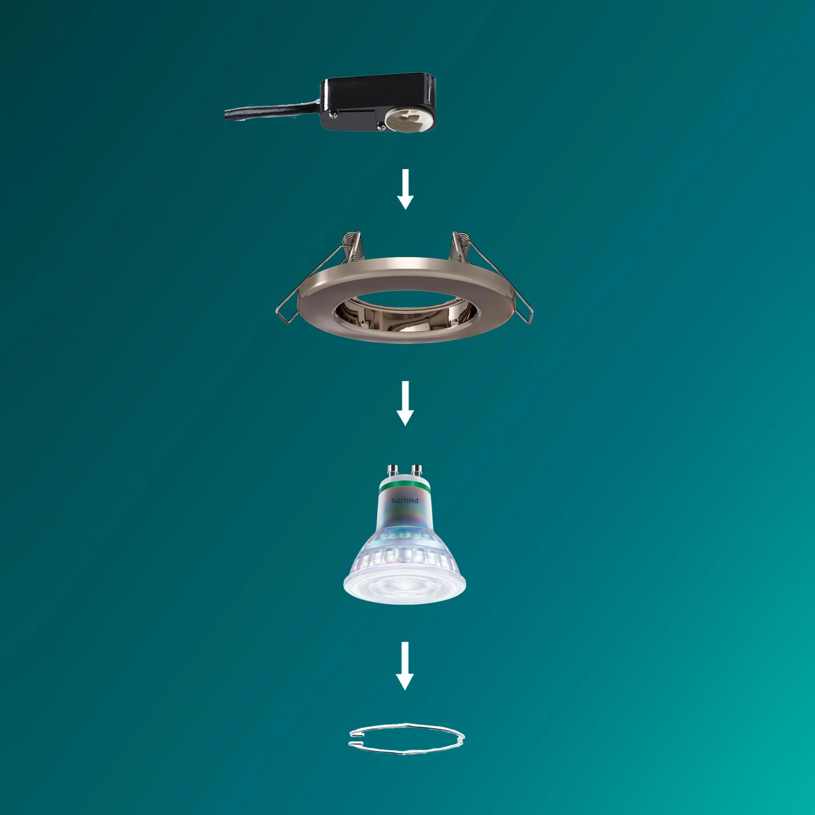 Noch nie war das Auswechseln einer Glühbirne so einfach. Dank der ausgeklügelten Konstruktion der Leuchte können Sie dies selbst vornehmen, ohne die Leuchte zu demontieren und ohne Schäden an der Decke zu riskieren. Entfernen Sie einfach den Befestigungsclip, nehmen Sie die verbrauchte Glühbirne heraus, setzen Sie die neue ein und befestigen Sie den Clip wieder. Der gesamte Vorgang dauert nur einen Augenblick und erfordert kein Werkzeug, so dass Komfort und Bequemlichkeit jeden Tag garantiert sind.