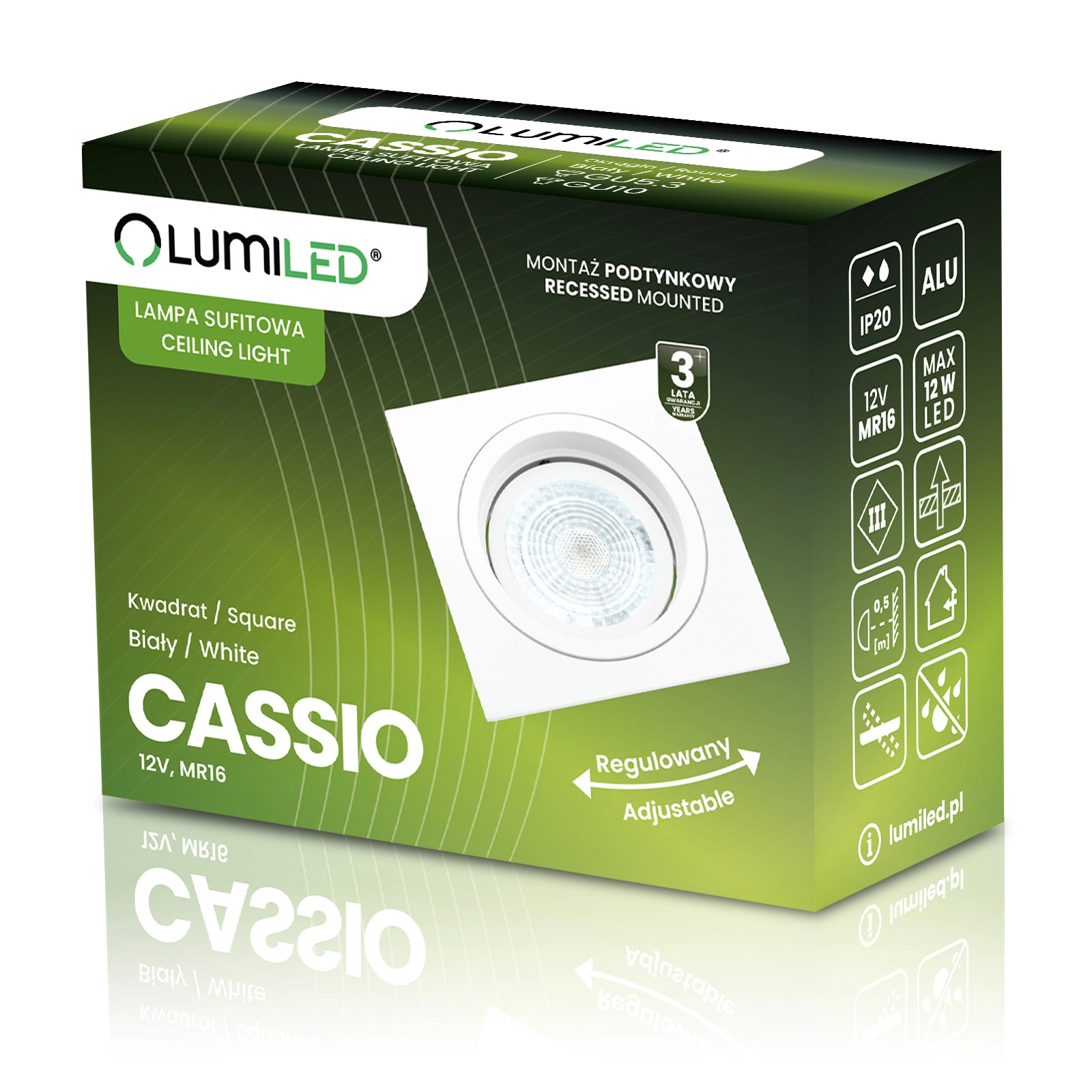 Einbauleuchte aus der CASSIO- Serie der in der Beleuchtungsbranche bekannten und anerkannten Marke Lumiled mit GU10-Sockel. Die Leuchte eignet sich perfekt für jeden Haushalt, jedes Geschäft, jedes Hotel oder Restaurant als Akzent- oder Dekorationsbeleuchtung.