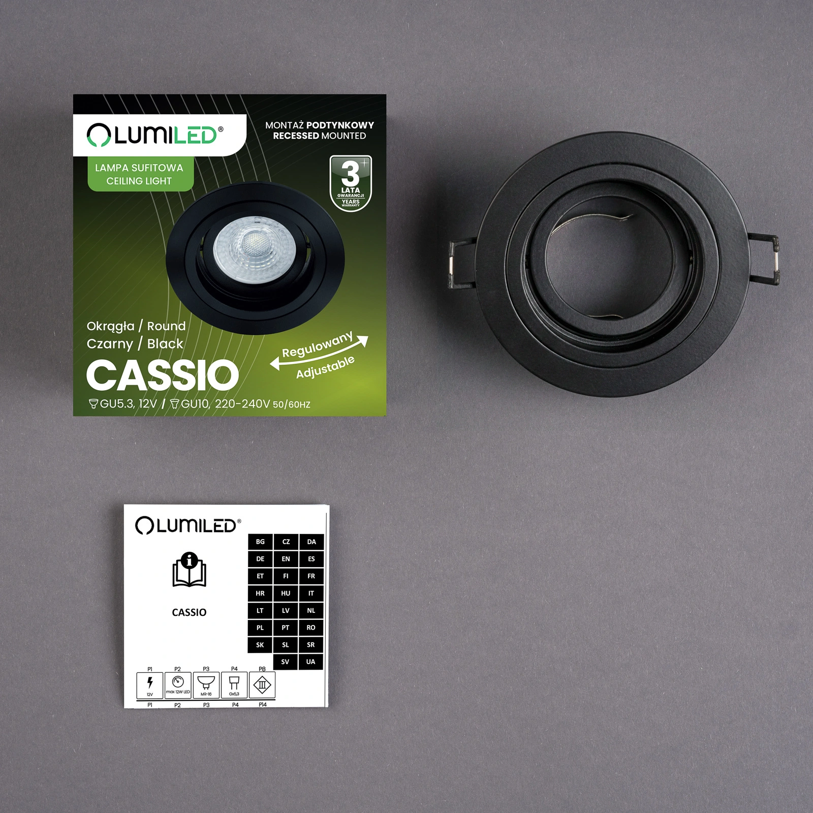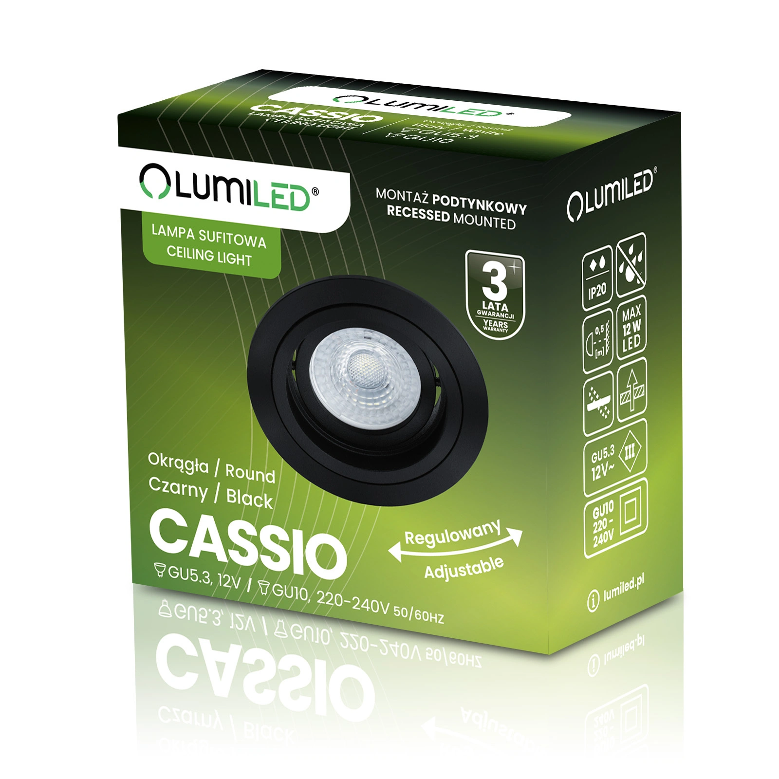 Einbauleuchte aus der CASSIO- Serie der in der Beleuchtungsbranche bekannten und anerkannten Marke Lumiled mit GU10-Sockel. Die Leuchte eignet sich perfekt für jeden Haushalt, jedes Geschäft, jedes Hotel oder Restaurant als Akzent- oder Dekorationsbeleuchtung.