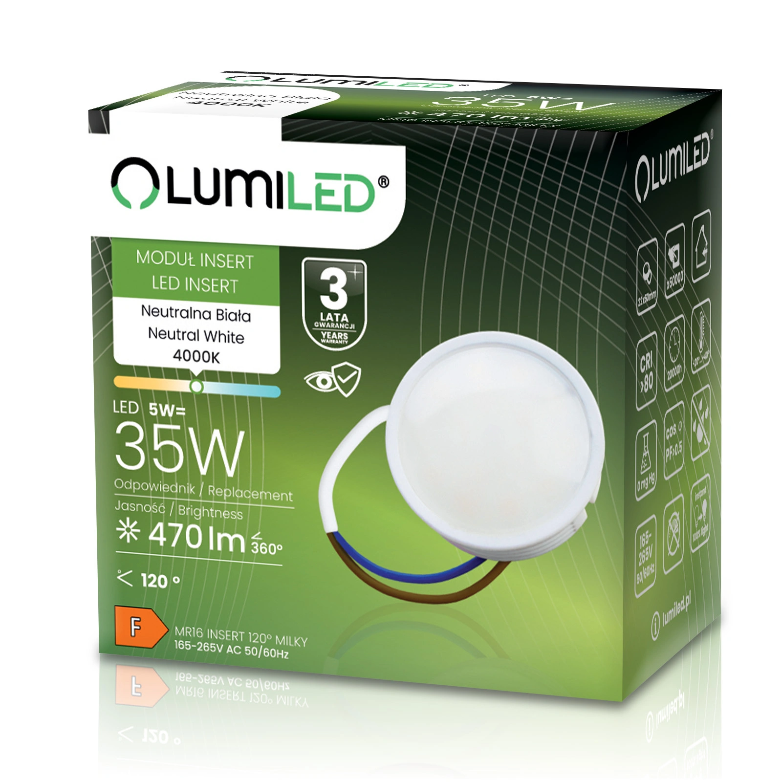 Die 5W-LED-Glühbirne der renommierten Marke LUMILED ist ein hervorragender Ersatz für herkömmliche 35W-Glühbirnen und bietet Energieeinsparungen und eine längere Lebensdauer. Sie emittiert Licht mit einem Lichtstrom von 470 Lumen und einer neutralen Farbe von 4000K, was sie ideal für die Innenbeleuchtung macht, wo eine helle und natürliche Lichtfarbe erforderlich ist. Der Abstrahlwinkel von 120° ermöglicht eine breite Streuung des Lichts und leuchtet den Raum effektiv aus. Dank ihrer hochwertigen Verarbeitung hat sie eine Lebensdauer von bis zu 15.000 Stunden, was einer langjährigen Nutzung entspricht. Außerdem arbeitet sie in einem weiten Spannungsbereich von 165-265 V und ist für den Einsatz bei Umgebungstemperaturen von -20°C bis +40°C geeignet. Eine ideale Wahl für alle, die Wert auf Energieeinsparung und Umweltschutz legen.