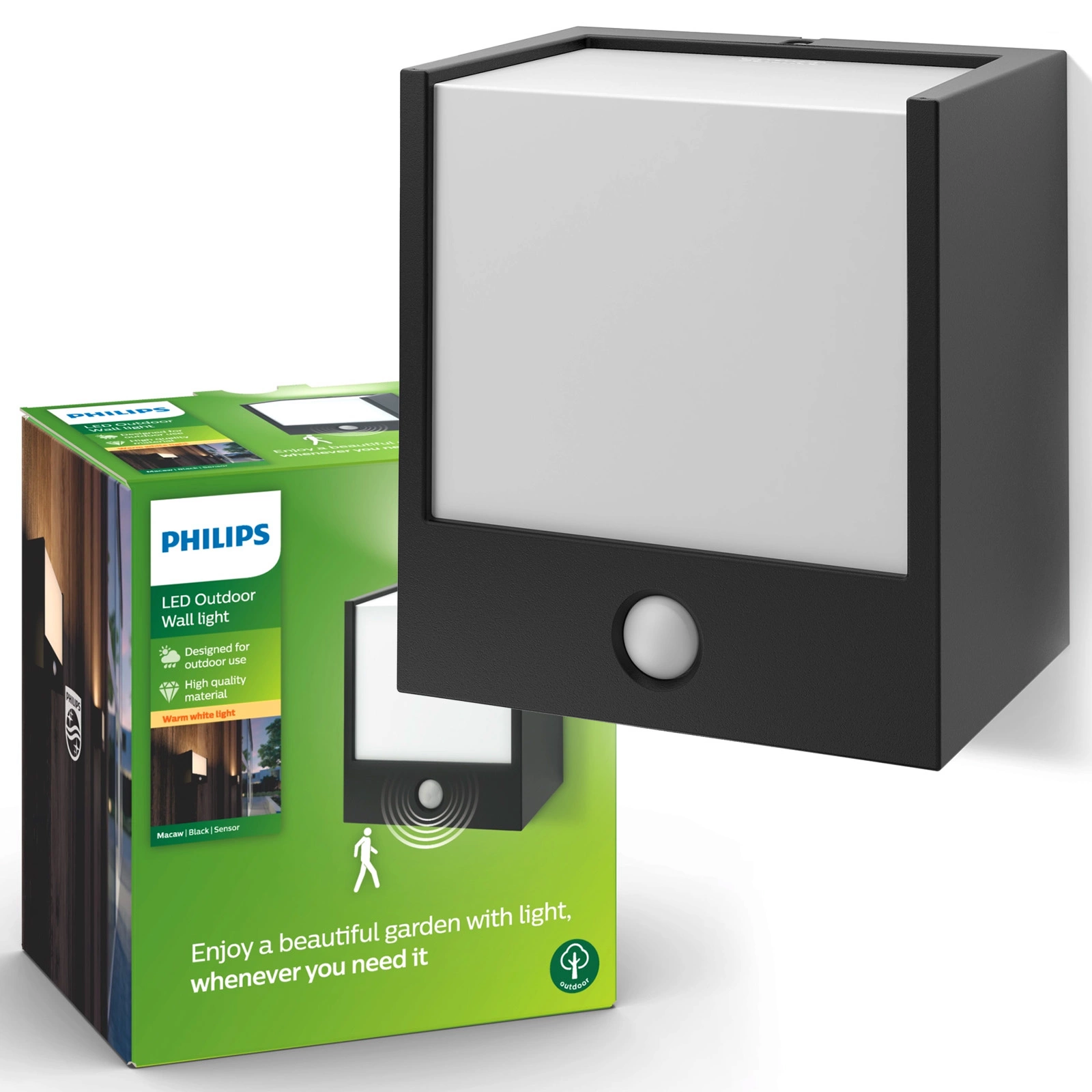 Der im Lieferumfang enthaltene Bewegungssensor schaltet das Licht automatisch ein, wenn eine Aktivität erkannt wird - für mehr Komfort und Sicherheit. Er lässt die Lampe aufleuchten, wenn Sie nach Hause kommen oder wenn jemand in der Nähe erscheint. Dies ist eine praktische Lösung, die es Ihnen erleichtert, sich nach Einbruch der Dunkelheit zurechtzufinden und Energie zu sparen.