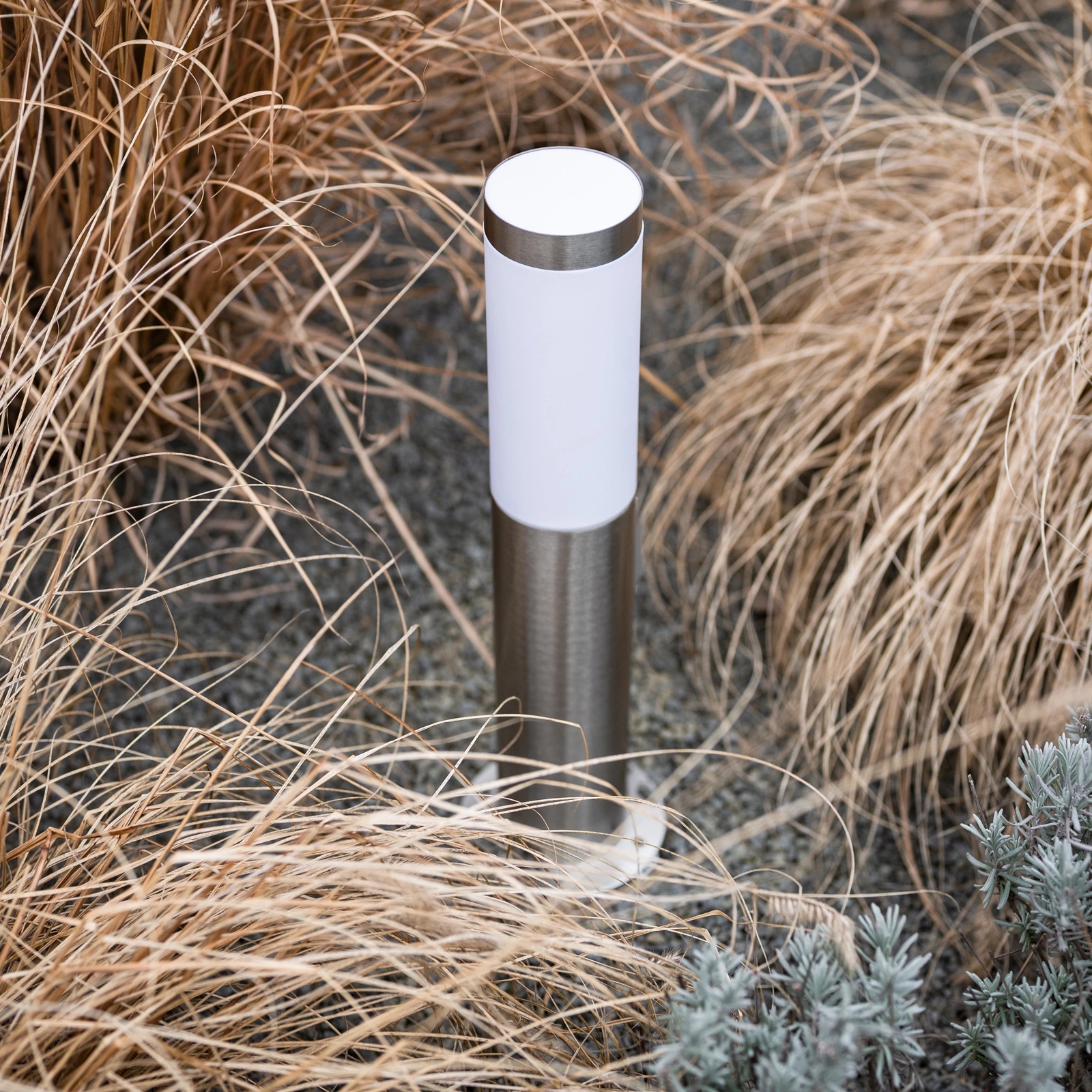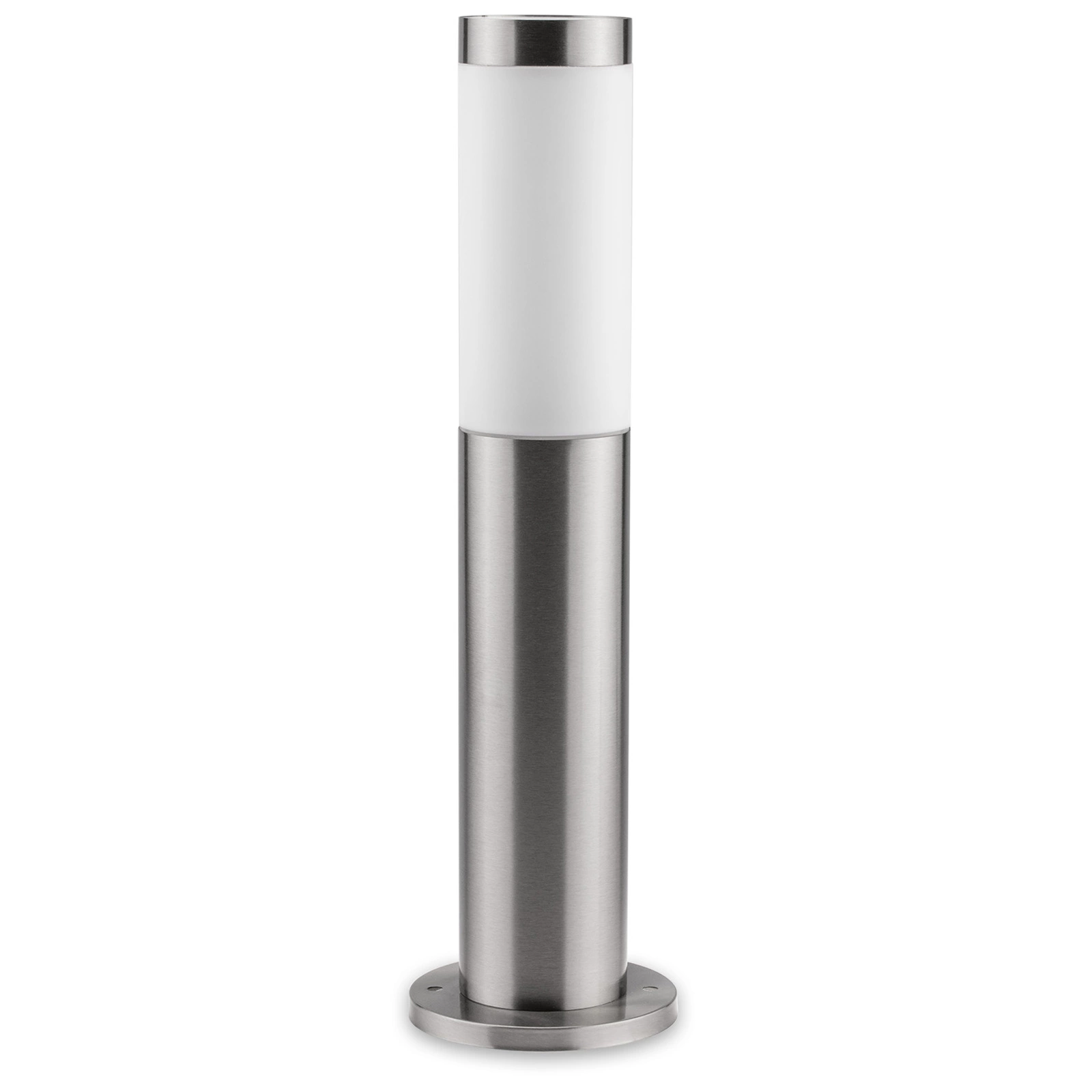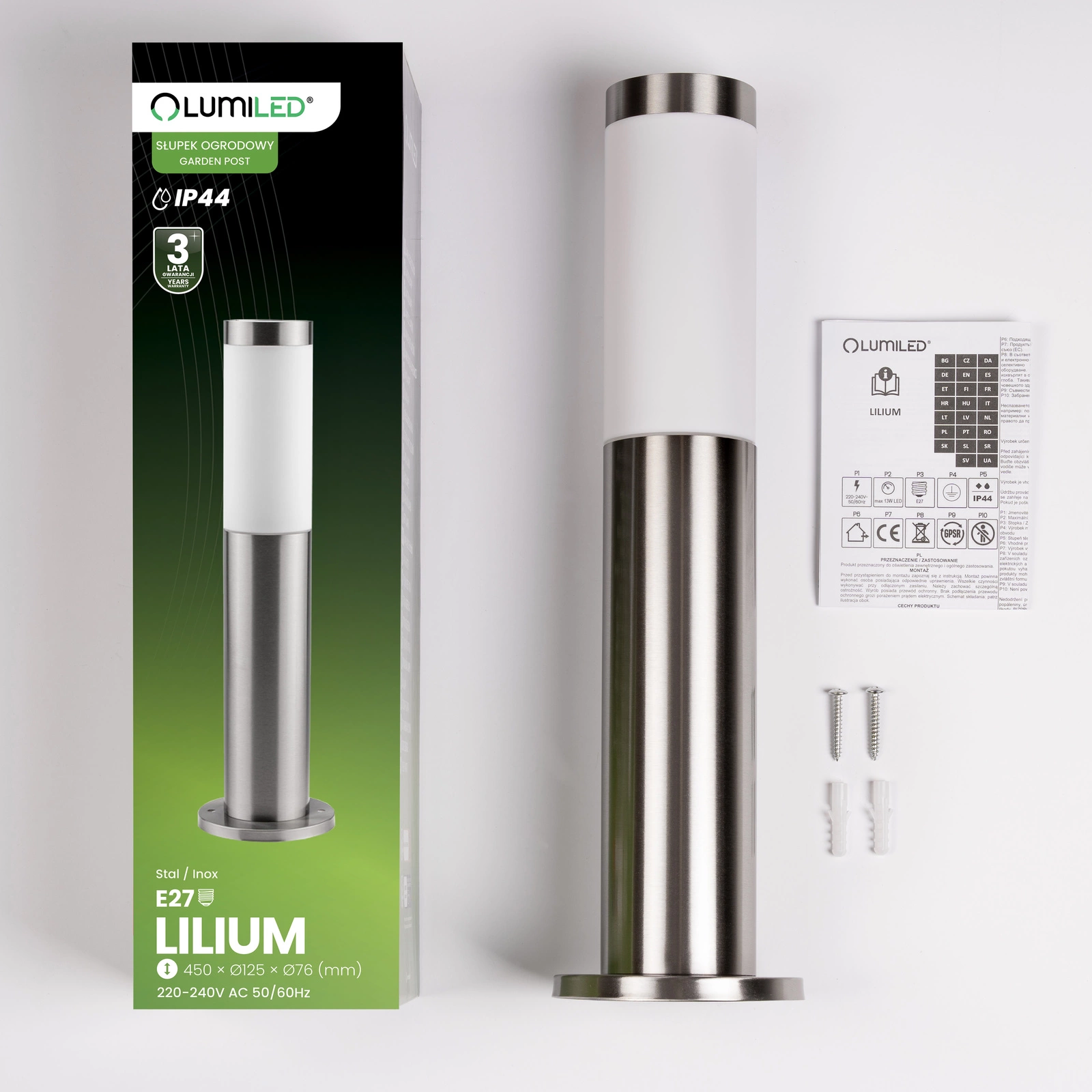 Gartenleuchte, Außenmast mit einer Höhe von 45cm in der Farbe inox der Serie LILIUM von LUMILED. Die Lampe ist aus hochwertigem Edelstahl und Kunststoff gefertigt. Die Verwendung von rostfreiem Stahl für die Lampe macht sie langlebig, leicht zu reinigen und attraktiv im Aussehen. Die Leuchte wurde mit Blick auf ihre Benutzer entwickelt und verwendet den beliebten E27-Schraubsockel, in den jede beliebige Glühbirne mit diesem Gewinde eingeschraubt werden kann und der im Falle einer LED-Lampe eine Leistung von 12 W nicht überschreitet.