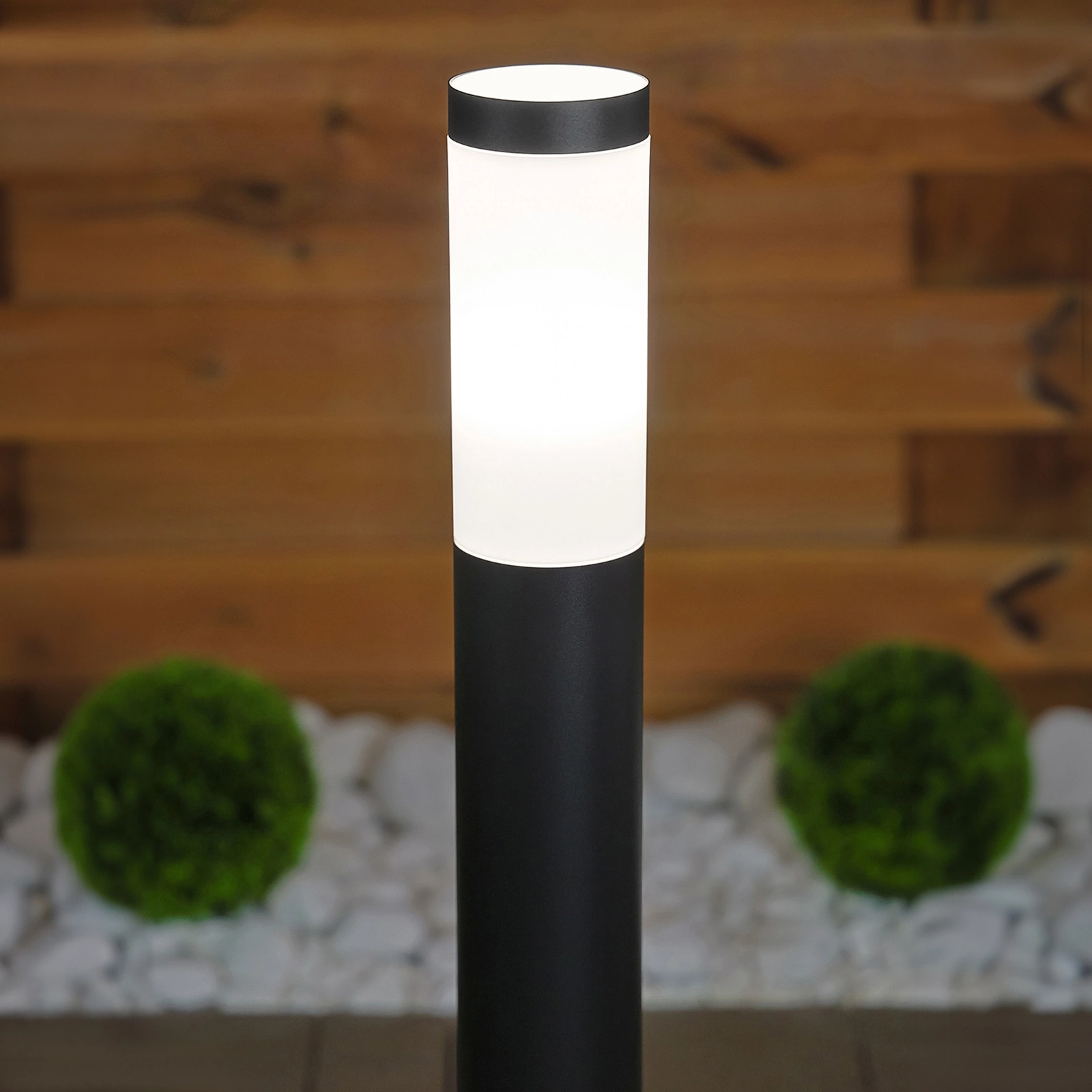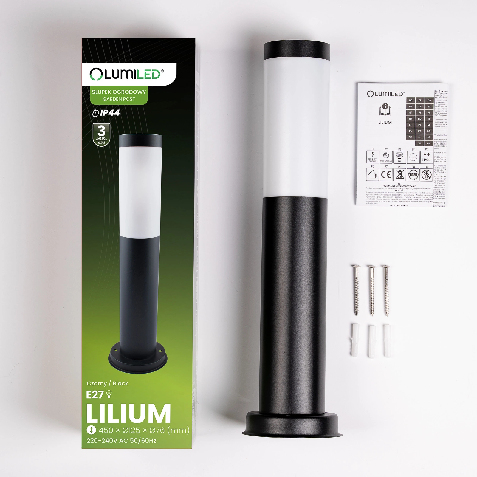 Gartenleuchte 45cm hoch in schwarz aus der LILIUM Serie von LUMILED. Die Lampe ist aus hochwertigem Edelstahl und Kunststoff gefertigt. Die Verwendung von rostfreiem Stahl für die Lampe macht sie langlebig, leicht zu reinigen und attraktiv im Aussehen. Die Leuchte wurde mit Blick auf ihre Benutzer entwickelt und verwendet den beliebten E27-Schraubsockel, in den jede Glühbirne mit diesem Gewinde eingeschraubt werden kann und dessen Leistung im Falle einer LED-Lampe 12 W nicht überschreitet.