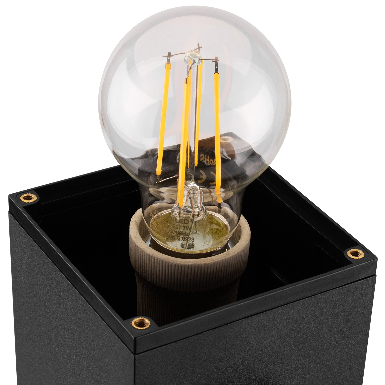 Die Gartensäule bietet dank der Möglichkeit, die Lichtquelle zu wechseln, Flexibilität bei der Beleuchtung. So können sowohl die Wattzahl als auch die Farbe des Lichts an die individuellen Bedürfnisse des Nutzers angepasst werden. Er ist mit jeder Glühbirne mit einem maximalen Durchmesser von 60 mm und einer Höhe von bis zu 115 mm kompatibel, was eine einfache Anpassung und eine breite Palette von Beleuchtungsoptionen ermöglicht. Sie ist ideal für jeden Garten und verbindet Funktionalität mit modernem Design. Sie ist die perfekte Lösung für alle, die Wert auf individuelle Gestaltung und Effizienz ihrer Außenbeleuchtung legen.