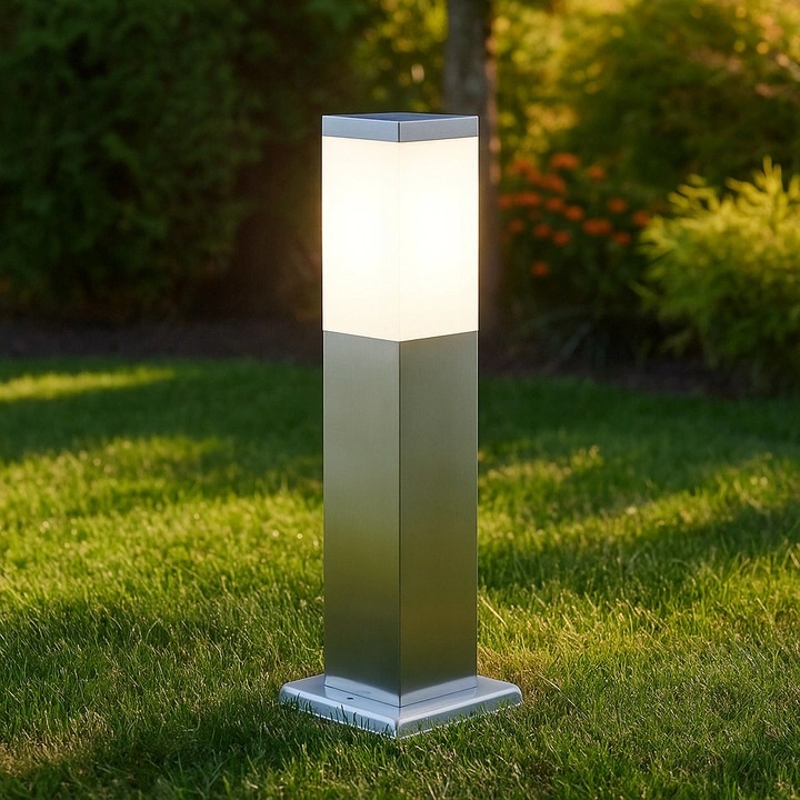 Gartenlampe, Außenpfosten 45cm hoch quadratisch in Silber. Lampe aus hochwertigem Edelstahl und Kunststoff. Die Verwendung von rostfreiem Stahl für die Lampe macht sie langlebig, leicht zu reinigen und attraktiv im Aussehen. Die Lampe mit austauschbarem Leuchtmittel ist mit einem gängigen E27-Schraubsockel ausgestattet - die maximale Wattzahl darf im Falle einer LED-Glühbirne 40W nicht überschreiten. Lampe zeichnet sich vor allem durch sein schönes, modernes Design und seine problemlose Installation aus. Dank ihrer erhöhten Witterungsbeständigkeit wird die Lampe vor allem zur Beleuchtung von Gartenwegen und Einfahrten eingesetzt. Die Verwendung des gängigen E27-Gewindes in der Lampe gibt uns die Möglichkeit, eine für unsere Bedürfnisse geeignete Glühbirne zu verwenden.HAUPTMERKMALE DER LEUCHTE:
