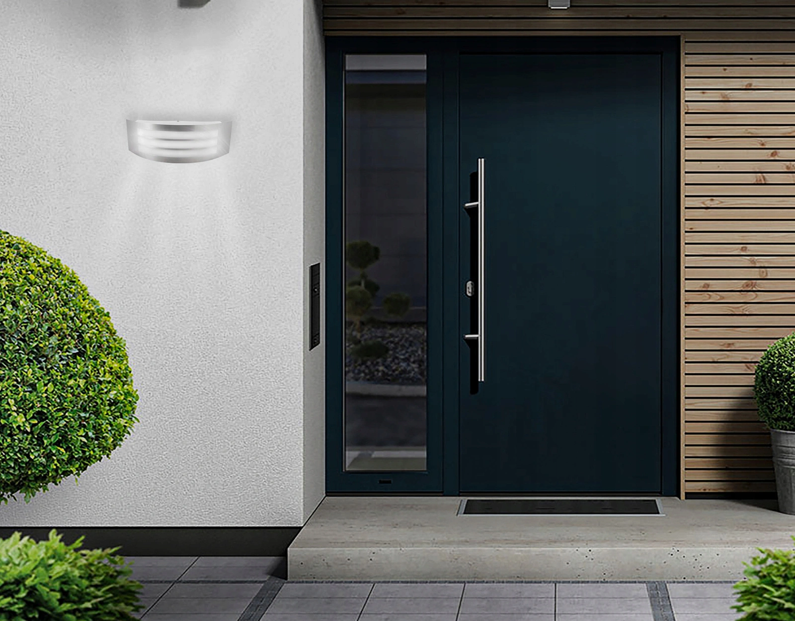 Die Wandleuchte ist für den Außenbereich geeignet, die Schutzart IP44 sorgt für eine hohe Witterungsbeständigkeit der Leuchte . Die Lampe ist direkt an die 230V-Spannung angepasst , sodass die Installation zusätzlicher Geräte nicht erforderlich ist.