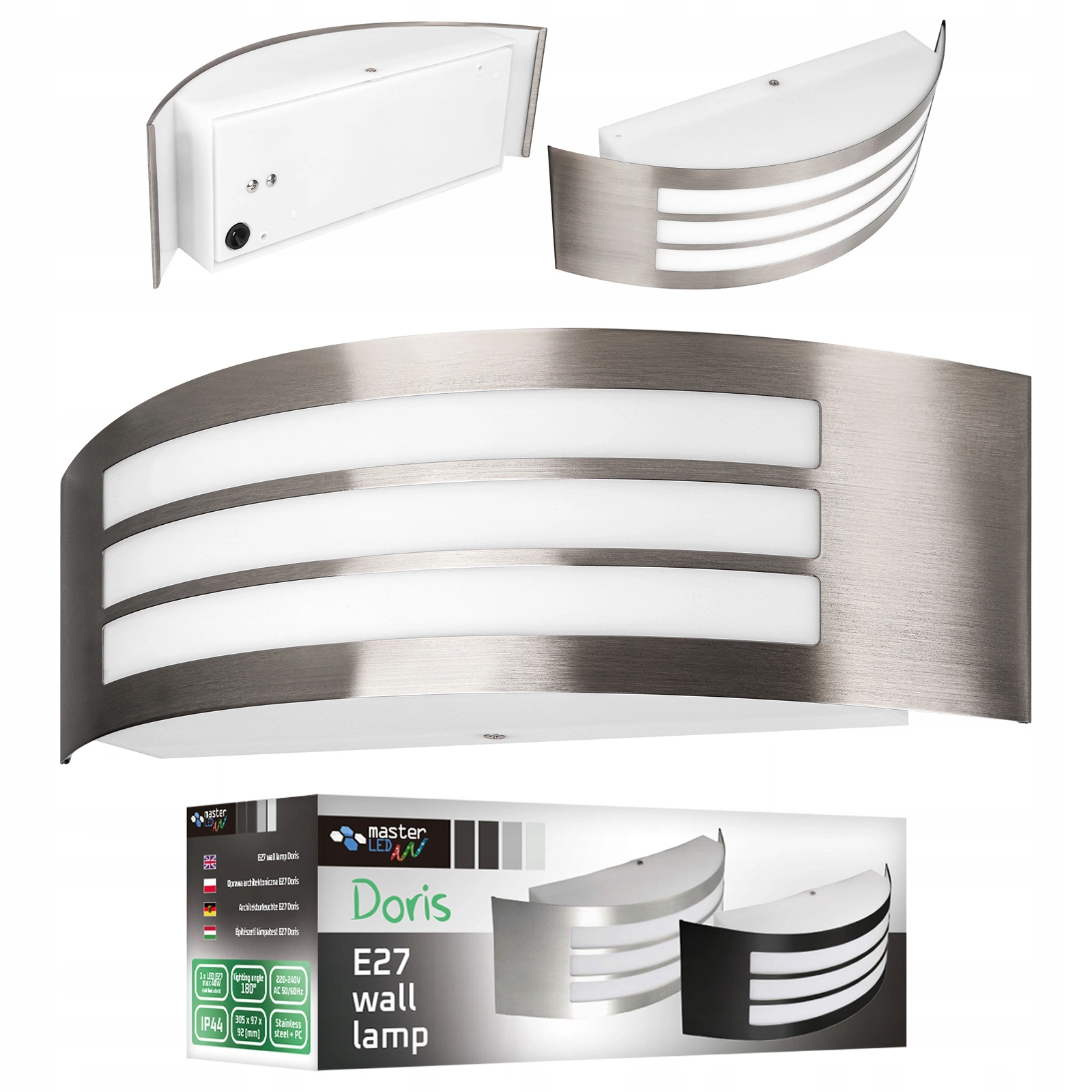 Die Gartenwandleuchte Doris, silber, ist eine Leuchte aus hochwertigem Edelstahl und Kunststoff. Durch die Verwendung von Edelstahl ist die Lampe langlebig, leicht zu reinigen und optisch ansprechend. Die Wandleuchte ist mit einer gängigen E27-Fassung ausgestattet, die es Ihnen ermöglicht, die passende Lichtquelle für Ihre Bedürfnisse auszuwählen – die Leistung der Lichtquelle sollte 40 W nicht überschreiten.