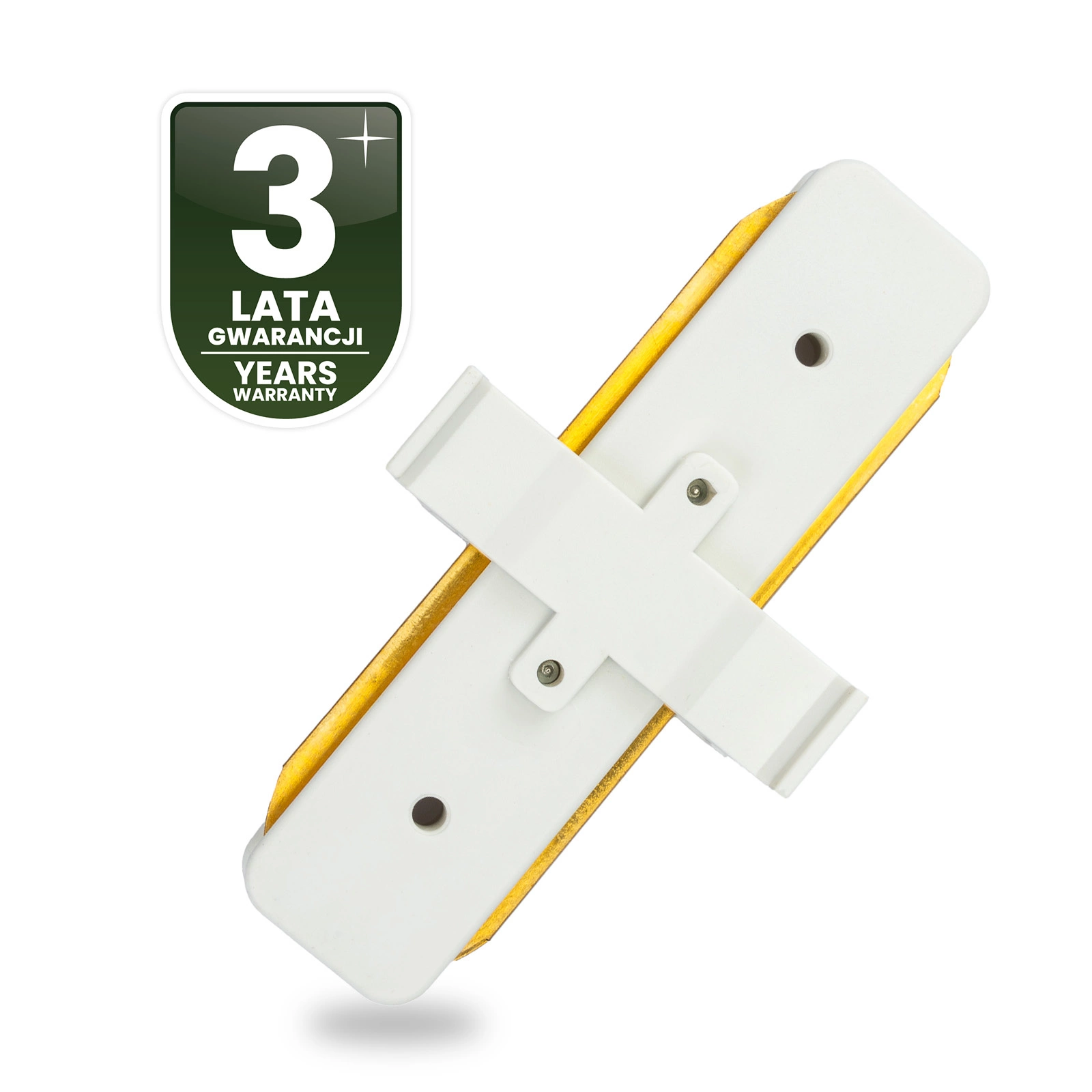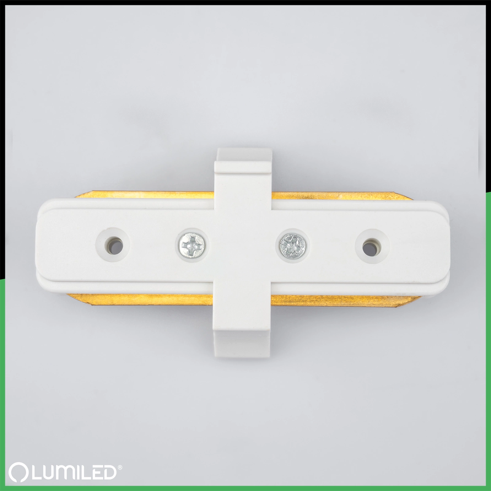 Ein gerader Steckverbinder in Weiß , der die Verbindung zweier Stromschienen ermöglicht . Durch den Einsatz von Verbindern können Sie die Schienen für Stromschienenleuchten verlängern.