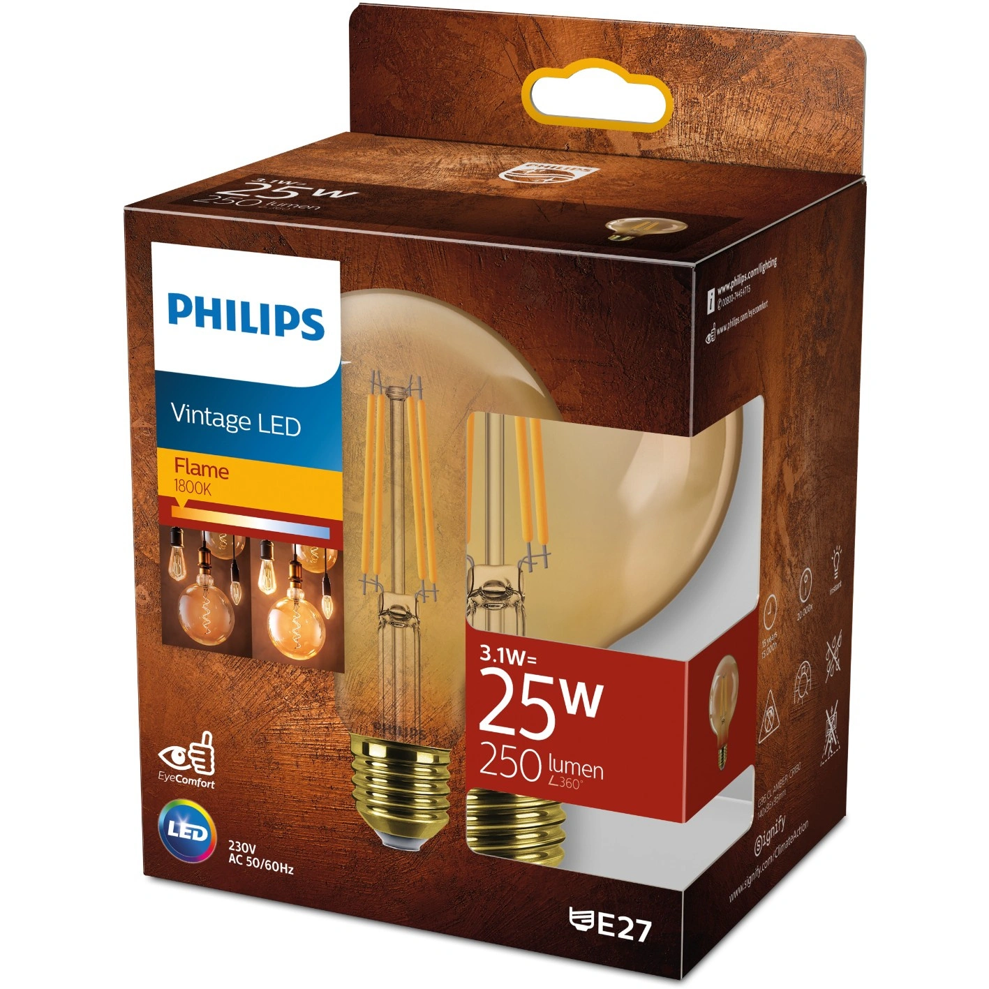 Die neue Deco-Linie bietet die perfekte Kombination aus warmweißem Licht mit dezenten und minimalistischen Lichterlebnissen. Der klassische Look traditioneller Beleuchtung mit den Vorteilen von LEDs. Dank ihres modernen und eleganten Designs ist sie ein perfekter Ersatz für herkömmliche gefrostete Glühbirnen. Eine Glühbirne aus transparentem Braunglas verleiht der Beleuchtung Ihres Zuhauses den Stil vergangener Epochen.