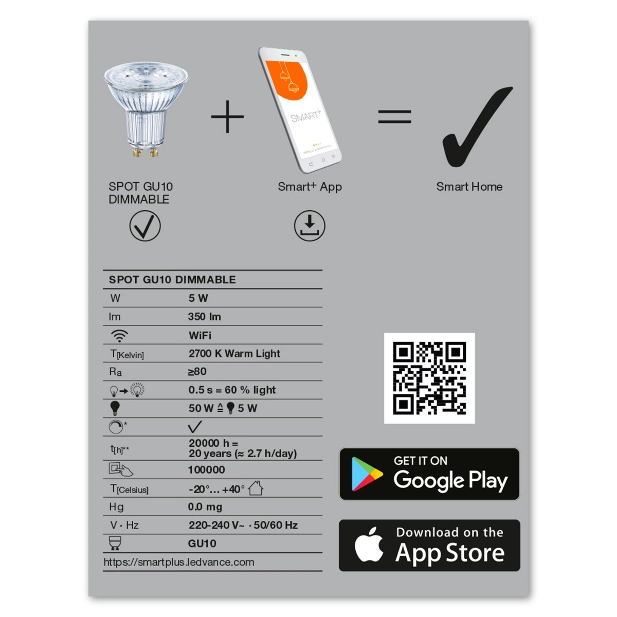 Entdecken Sie eine neue Lichtqualität mit der LED GU10 Reflector 4.9W = 50W 350lm dimmbar SMART+ WiFi Glühbirne von Ledvance. Diese Glühbirne bietet einen hellen Lichtstrom von 350 lm und eine Farbtemperatur, die dem Warmweiß entspricht. Mit einem Lichtabstrahlungswinkel von 45° ist sie ideal für die Beleuchtung von Wohn- und Geschäftsräumen und bietet eine effiziente und energiesparende Leistung.