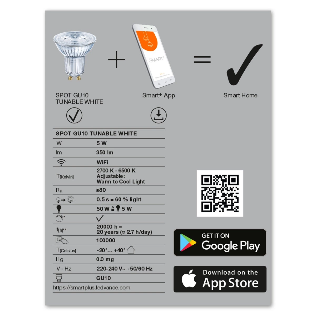 Entdecken Sie die moderne LED-Beleuchtung mit der 4,9W GU10 Reflector-Lampe, die einer Helligkeit von 350lm entspricht. Dank der SMART+ WiFi-Funktion können Sie die Farbe des Lichts ganz einfach mit der CCT-Technologie einstellen, die variable Farbtemperaturen ermöglicht. Die Glühbirne bietet einen breiten Lichtabstrahlungswinkel von 45°, so dass Sie den Raum gleichmäßig beleuchten können.