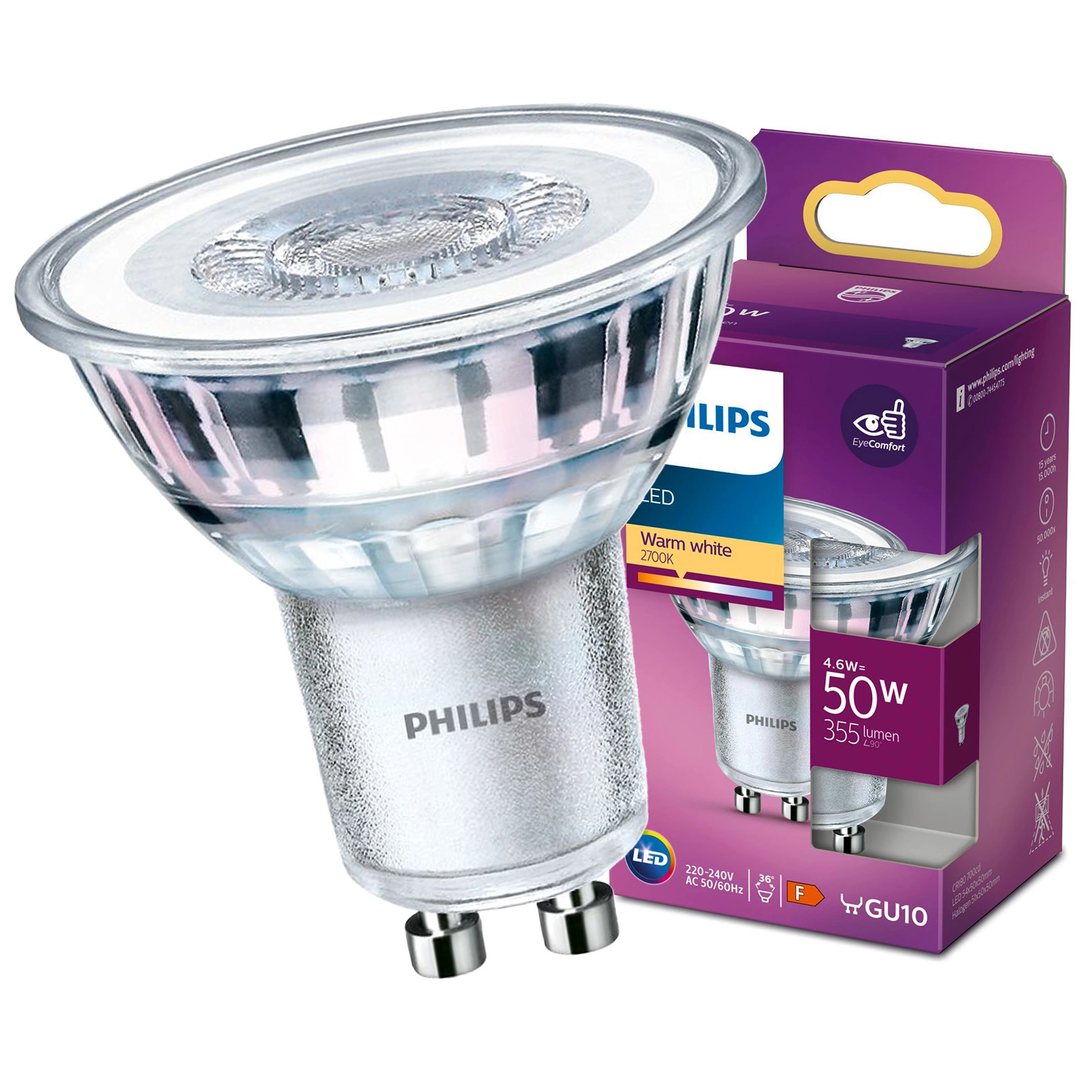 GU10 LED-Leuchtmittel 4,6W = 50W 355lm 2700K Warm 36° PHILIPS