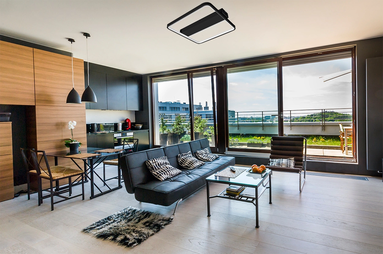 Modern LED-Kronleuchter. Es ist ausgestattet mit 310 SMD 2835 LEDs die über eine Dimmoption und änderungen der Lichtfarbe. Das Gerät kann über eine einer speziellen Fernbedienung (im Lieferumfang enthalten), mit dem man die Lichtintensität verringern oder erhöhen oder die Lichtfarbe von warm zu neutral oder kalt ändern kann. Die Fernbedienung funktioniert per Funk, d.h. wir müssen nicht auf einen bestimmten Punkt zielen, um Einstellungen zu ändern.
