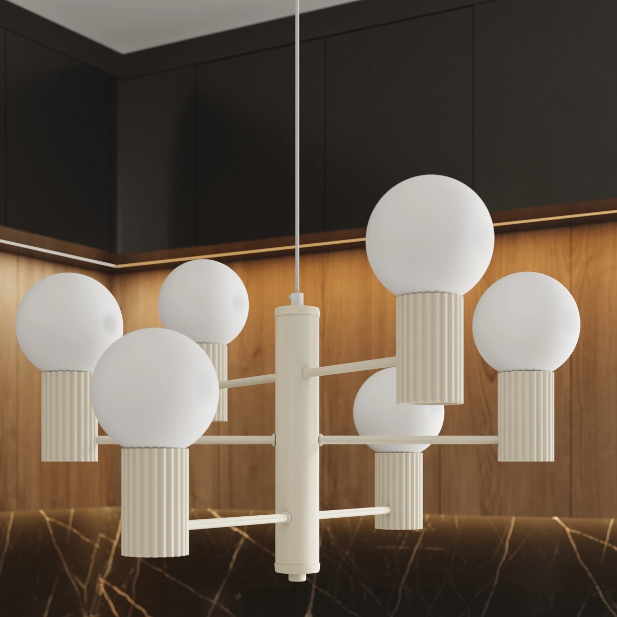Entdecken Sie die Einzigartigkeit der Halo French Sky 6x G9 Aluminium Beige Aluminum Chandelier Pendelleuchte der renommierten Marke Sollux. Diese stilvolle Lampe wird ein integraler Bestandteil Ihres Interieurs sein und es in einen Raum voller Charme und Modernität verwandeln. Mit ihrem geriffelten Aluminiumkörper und der subtilen, milchig gefrosteten Kugel bildet die Leuchte ein harmonisches Ganzes, das sich perfekt in jedes Dekor einfügt. Mit ihren 6 Lichtpunkten mit G9-Schraubsockel sorgt sie für perfektes warmes Licht, ideal für das Wohn-, Schlaf- oder Esszimmer.