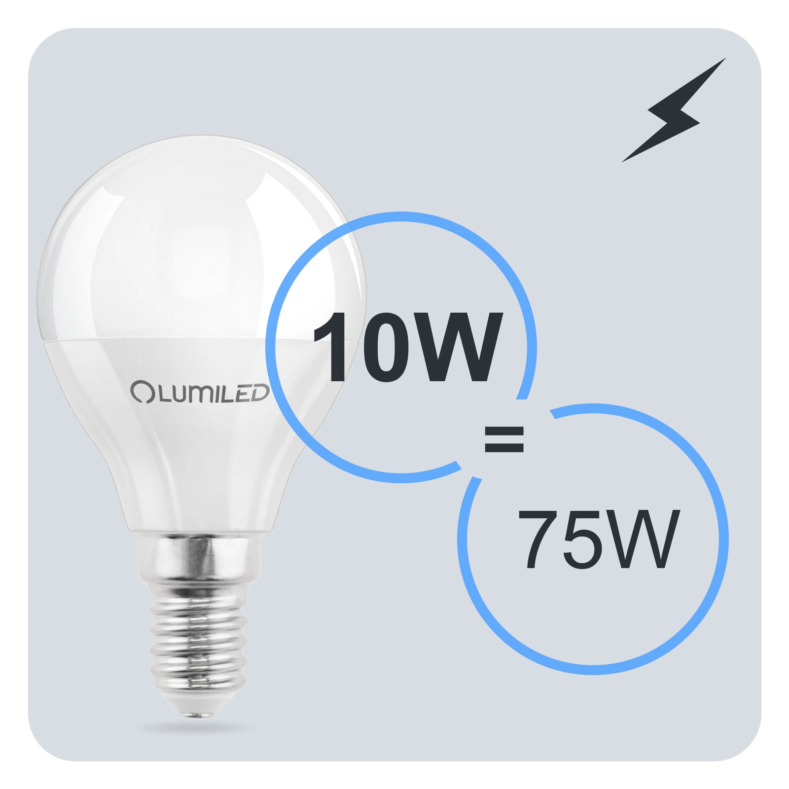 Die LED-Glühbirne der renommierten Marke LUMILED mit E14-Sockel und 10W ist ein hervorragender Ersatz für herkömmliche 75W-Glühbirnen und bietet Energieeinsparungen und eine längere Lebensdauer. Sie gibt Licht mit einem Lichtstrom von 1055 Lumen und einer warmen Lichtfarbe von 3000K ab und ist damit ideal für die Innenbeleuchtung, wo eine weiche, angenehme Lichtfarbe gewünscht wird. Der Abstrahlwinkel von 180° ermöglicht eine breite Lichtstreuung, die den Raum effektiv ausleuchtet. Dank ihrer hochwertigen Verarbeitung hat sie eine Lebensdauer von bis zu 15.000 Stunden, was einer langjährigen Nutzung entspricht. Zudem arbeitet sie in einem weiten Spannungsbereich von 165-265 V und ist für den Einsatz bei Umgebungstemperaturen von -20°C bis +40°C geeignet. Eine ideale Wahl für alle, die Wert auf Energieeinsparung und Umweltschutz legen.