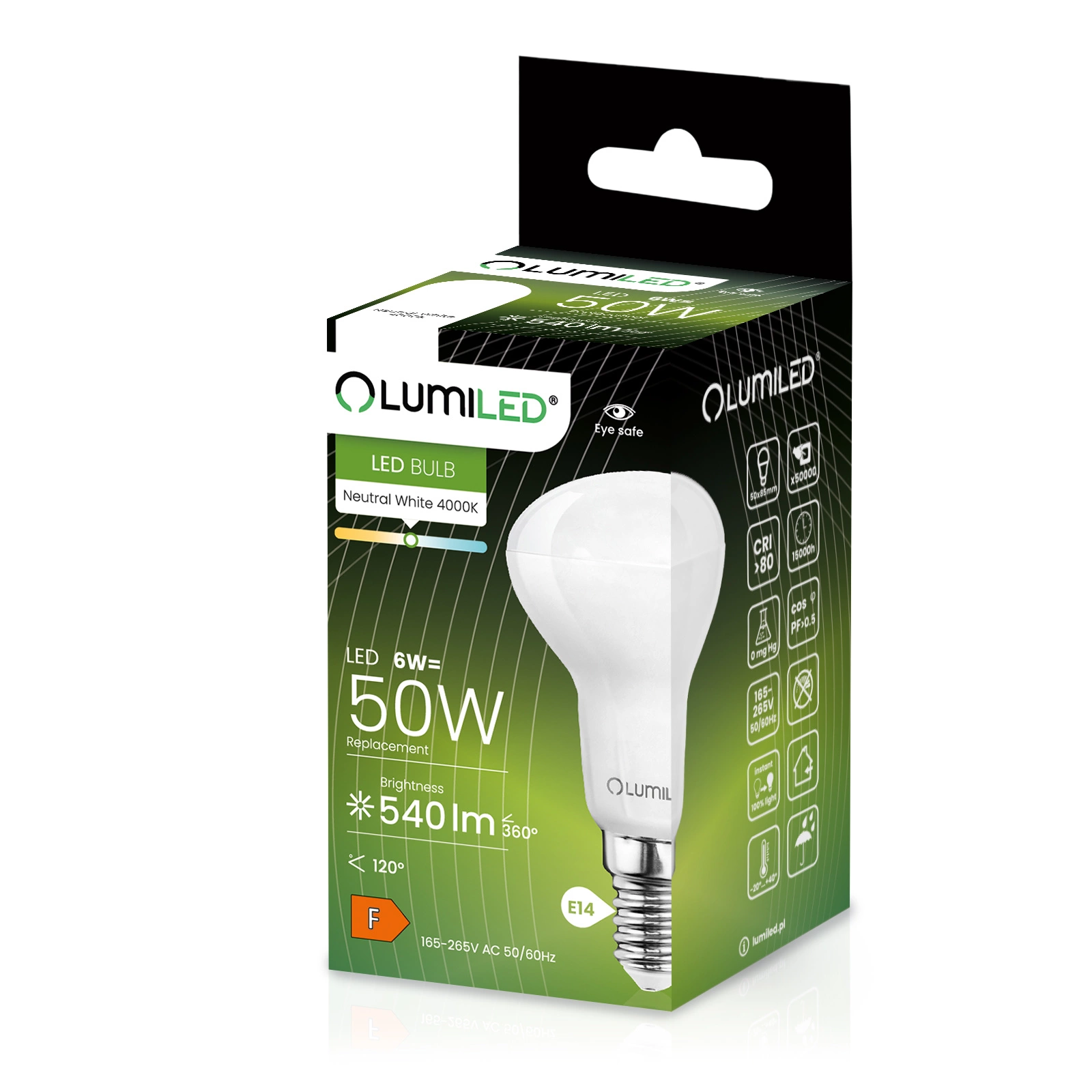 Die LED-Glühbirne der renommierten Marke LUMILED mit E14-Sockel und 6W ist ein hervorragender Ersatz für herkömmliche 50W-Glühbirnen und bietet Energieeinsparungen und eine längere Lebensdauer. Sie emittiert Licht mit einem Lichtstrom von 540 Lumen und einer neutralen Farbe von 4000K, was sie ideal für die Innenbeleuchtung macht, wo eine helle und natürliche Lichtfarbe erforderlich ist. Der Abstrahlwinkel von 120° ermöglicht eine breite Streuung des Lichts und leuchtet den Raum effektiv aus. Dank ihrer hochwertigen Verarbeitung hat sie eine Lebensdauer von bis zu 15.000 Stunden, was einer langjährigen Nutzung entspricht. Zudem arbeitet sie in einem weiten Spannungsbereich von 165-265 V und ist für den Einsatz bei Umgebungstemperaturen von -20°C bis +40°C geeignet. Eine ideale Wahl für alle, die Wert auf Energieeinsparung und Umweltschutz legen.