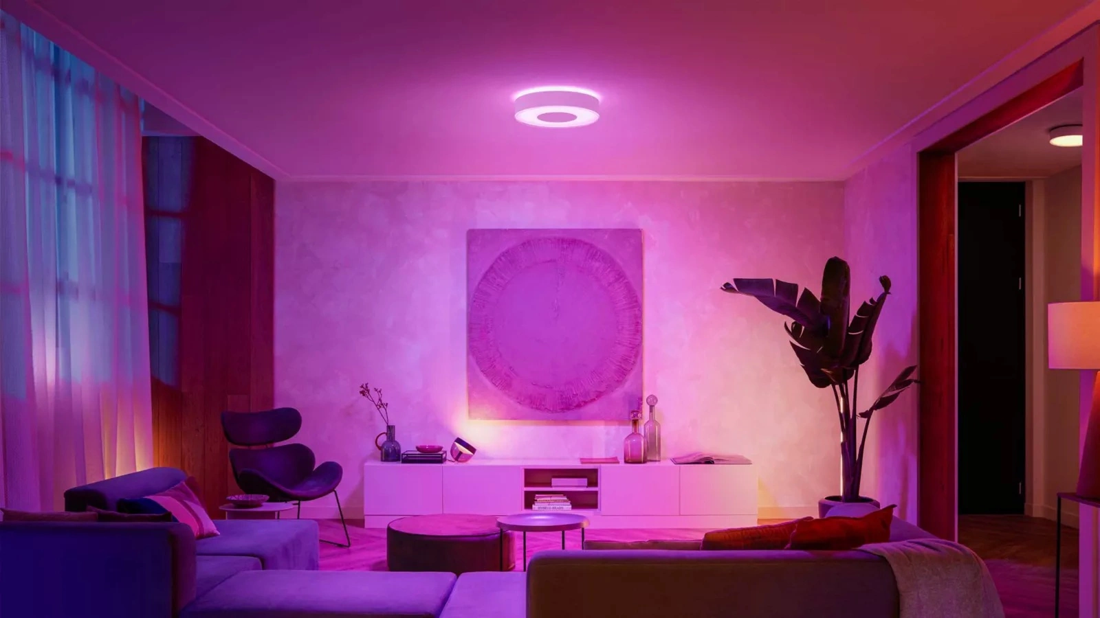 HUE LED-Deckenfluter in der Beleuchtungsindustrie bekannt und respektiert Philips. Leuchte mit einer integrierten LED-Lichtquelle von 52,5W und sehr effiziente Lichtleistung - 3700lm, strahlt warmes, angenehmes und entspannendes Licht, mit 16 Millionen RGB-Farben i eine breite Palette von weißem Licht, mit denen wir für jede Gelegenheit eine passende Stimmung schaffen können. Neben der Steuerung des Lichts über die gesamte Farbtemperaturskala verfügt die Lampe über eine sofortiges Dimmen. HUE Plafond als farbiger Lichtakzent wird es den Raum und jedes Element der Inneneinrichtung erhellen.