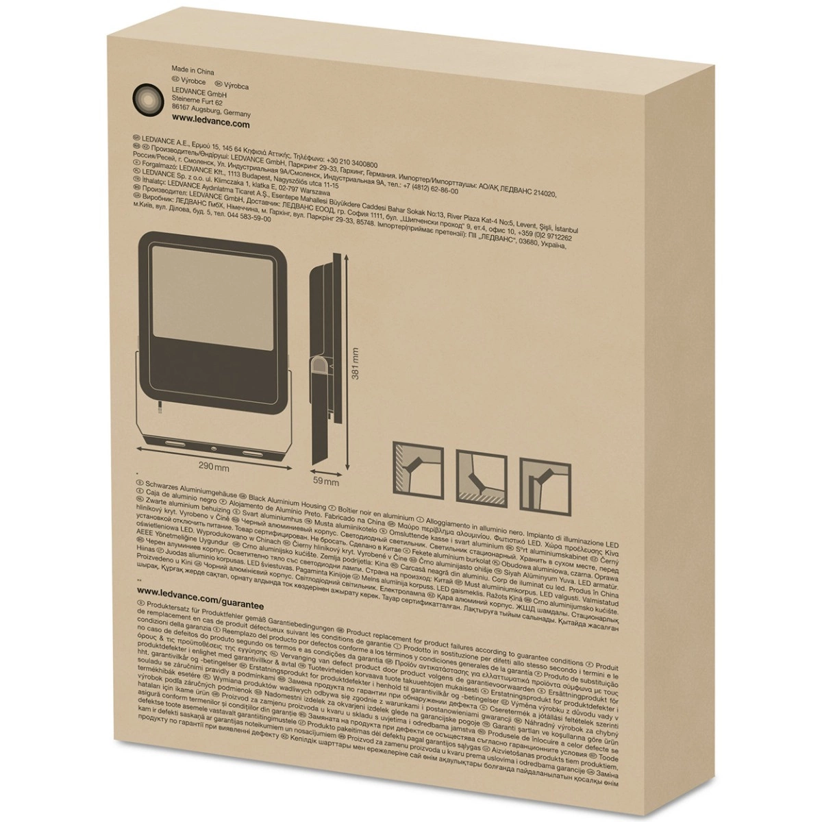 Leistungsstarkes LED-Flutlicht in schwarz eine bekannte Marke auf dem Beleuchtungsmarkt LEDVANCE ist eine moderne Beleuchtung, die sich durch eine sehr gute Qualität des ausgestrahlten LICHTS, hohe Haltbarkeit, Beständigkeit gegen schwere Witterungsbedingungen (wasserdicht) und mechanische Beschädigungen auszeichnet. Die kompakten Abmessungen und das geringe Gewicht ermöglichen eine einfache Installation anstelle der alten, verschlissenen und stromfressenden traditionellen Halogenlampen. Darüber hinaus bietet der Scheinwerfer eine Energieeinsparung von bis zu 90 % (im Vergleich zu Scheinwerfern mit Halogenlampen).