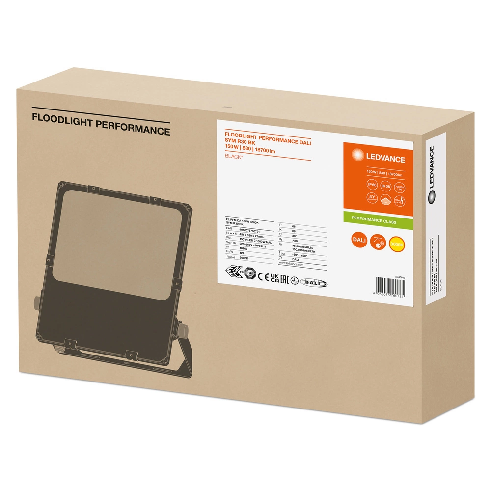 Ledvance stellt einen hochmodernen LED-Flutlichtstrahler vor, der hohe Leistung und Haltbarkeit in rauen Außenumgebungen vereint. Das Produkt ist für die Beleuchtung großer Flächen wie Parkplätze, Industriegelände und Erholungsgebiete konzipiert. Dank des Einsatzes von LED-Technologie bietet der Scheinwerfer eine unglaubliche Helligkeit von 18700 Lumen bei einer Energieeffizienz von 150 W. Die Lichtfarbe beträgt angenehme 3000K, was ein warmes, augenfreundliches Licht erzeugt.
