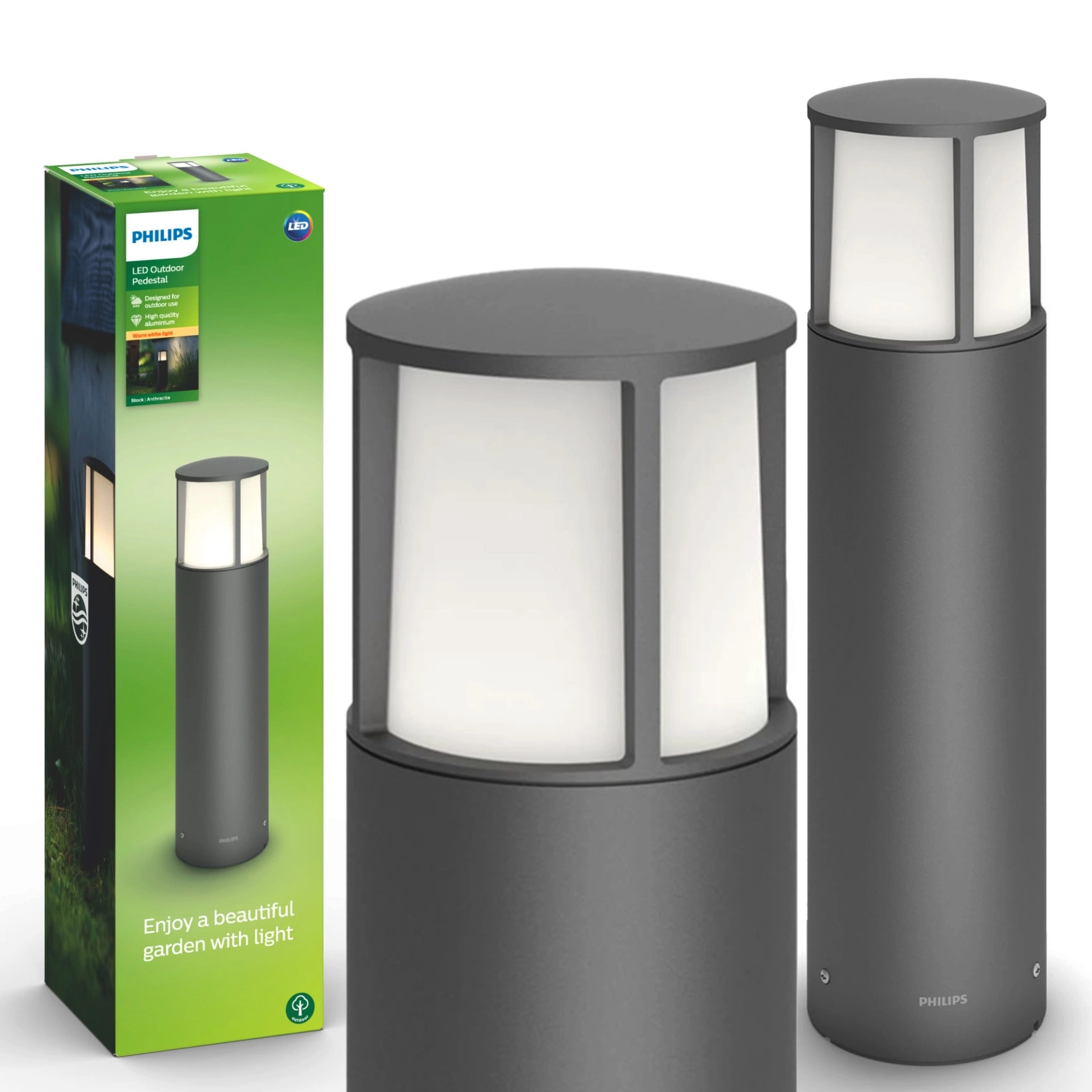 Bringen Sie Eleganz und Modernität in Ihren Garten mit unserer 40 cm hohen Outdoor Pole Garden Lamp. Ausgestattet mit einer energieeffizienten 5,5W-LED strahlt die Lampe ein angenehmes, warmes Licht mit einer Farbtemperatur von 2700K und einer Helligkeit von 600 Lumen aus, das den Charme Ihres Außenbereichs perfekt unterstreicht. Dank der Schutzart IP44 ist sie witterungsbeständig und somit eine äußerst langlebige Wahl für jeden Garten. Das Produkt wurde von der renommierten Marke Philips mit viel Liebe zum Detail entwickelt und garantiert Zuverlässigkeit und ein hohes Maß an Ästhetik. Genießen Sie bis zu 25.000 Stunden schöne Beleuchtung, die nicht nur die Sicherheit erhöht, sondern auch eine einzigartige, auffällige Aura schafft. Ideal für alle, die stilvolle und funktionale Beleuchtungslösungen zu schätzen wissen.