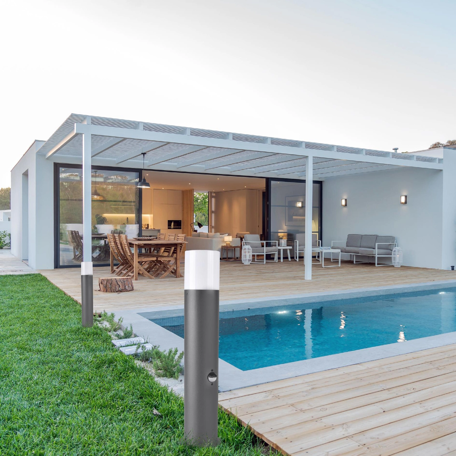 Die Leuchte ist für den Betrieb mit energiesparenden LED-Lichtquellen mit einer maximalen Leistung von 12W, die sich vor allem durch einen deutlich reduzierten Stromverbrauch auszeichnen (Einsparungen von bis zu 80%). Die Konstruktion der Leuchte und die verwendeten Materialien gewährleisten eine hohe mechanische Festigkeit und Widerstandsfähigkeit gegen das Eindringen von Wasser und Staub. Ein zusätzlicher Vorteil der Leuchte ist der in der Leuchte eingebaute Bewegungs- und Dämmerungssensor, der die Lichtquelle am Abend aktiviert, wenn eine Bewegung erkannt wird. Die Lampe erkennt eine Bewegung in einer Entfernung von 2 Metern und leuchtet für eine vordefinierte Zeitspanne auf - von 10 Sekunden bis 4 Minuten. Die Leuchte mit Bewegungs- und Dämmerungssensor bietet eine hohe Energieeffizienz, einen hohen Nutzungskomfort und erleichtert die Orientierung in Gartenwegen. Die richtige Gartenleuchte erleichtert es, sich abends auf dem Grundstück zu bewegen. Sie beleuchtet es nicht nur, sondern verleiht ihm auch eine magische Atmosphäre, die den Aufenthalt dort noch angenehmer macht.
