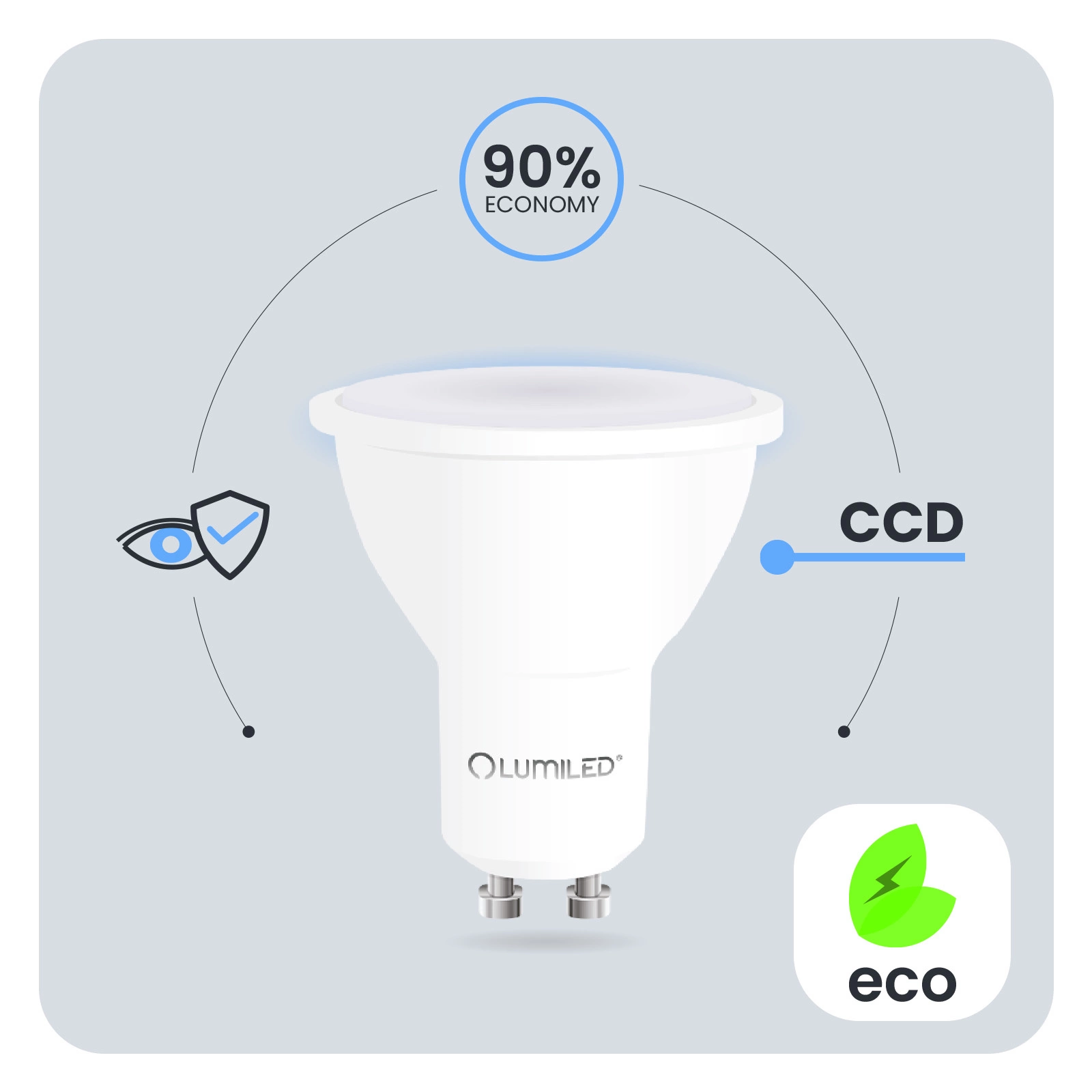 Der in der LED-Glühbirne verwendete CCD-Inverter macht die Glühbirne widerstandsfähig gegen Einbrüche und Spitzen in der Netzspannung. Das Licht flackert und zittert nicht. Der CCD-Konverter sorgt dafür, dass die Glühbirne über einen langen Zeitraum hinweg einwandfrei funktioniert. Bei der Entwicklung der LUMILED-Glühbirnen wurde an den Benutzer gedacht. Eine schlechte Beleuchtungsqualität kann zur Ermüdung der Augen führen. Deshalb verfügen unsere Lampen über die technische Entwicklung Eye Safe, um in jedem Raum eine angenehme und augenfreundliche Beleuchtung zu gewährleisten.