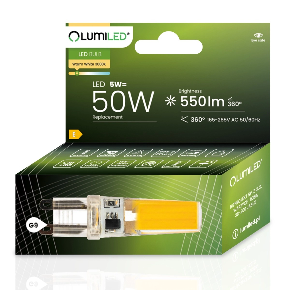 Die LED-Glühbirne der renommierten Marke LUMILED mit G9-Sockel und 5W ist ein hervorragender Ersatz für herkömmliche 50W-Glühbirnen und bietet Energieeinsparungen und eine längere Lebensdauer. Sie gibt Licht mit einem Lichtstrom von 550 Lumen und einer warmen Lichtfarbe von 3000K ab und ist damit ideal für die Innenbeleuchtung, wo eine weiche, angenehme Lichtfarbe gewünscht wird. Der Abstrahlwinkel von 360° ermöglicht eine breite Streuung des Lichts und eine effektive Ausleuchtung des Raums. Dank ihrer hochwertigen Verarbeitung hat sie eine Lebensdauer von bis zu 15.000 Stunden, was einer langjährigen Nutzung entspricht. Zudem arbeitet sie in einem weiten Spannungsbereich von 165-265 V und ist für den Einsatz bei Umgebungstemperaturen von -20°C bis +40°C geeignet. Eine ideale Wahl für alle, die Wert auf Energieeinsparung und Umweltschutz legen.