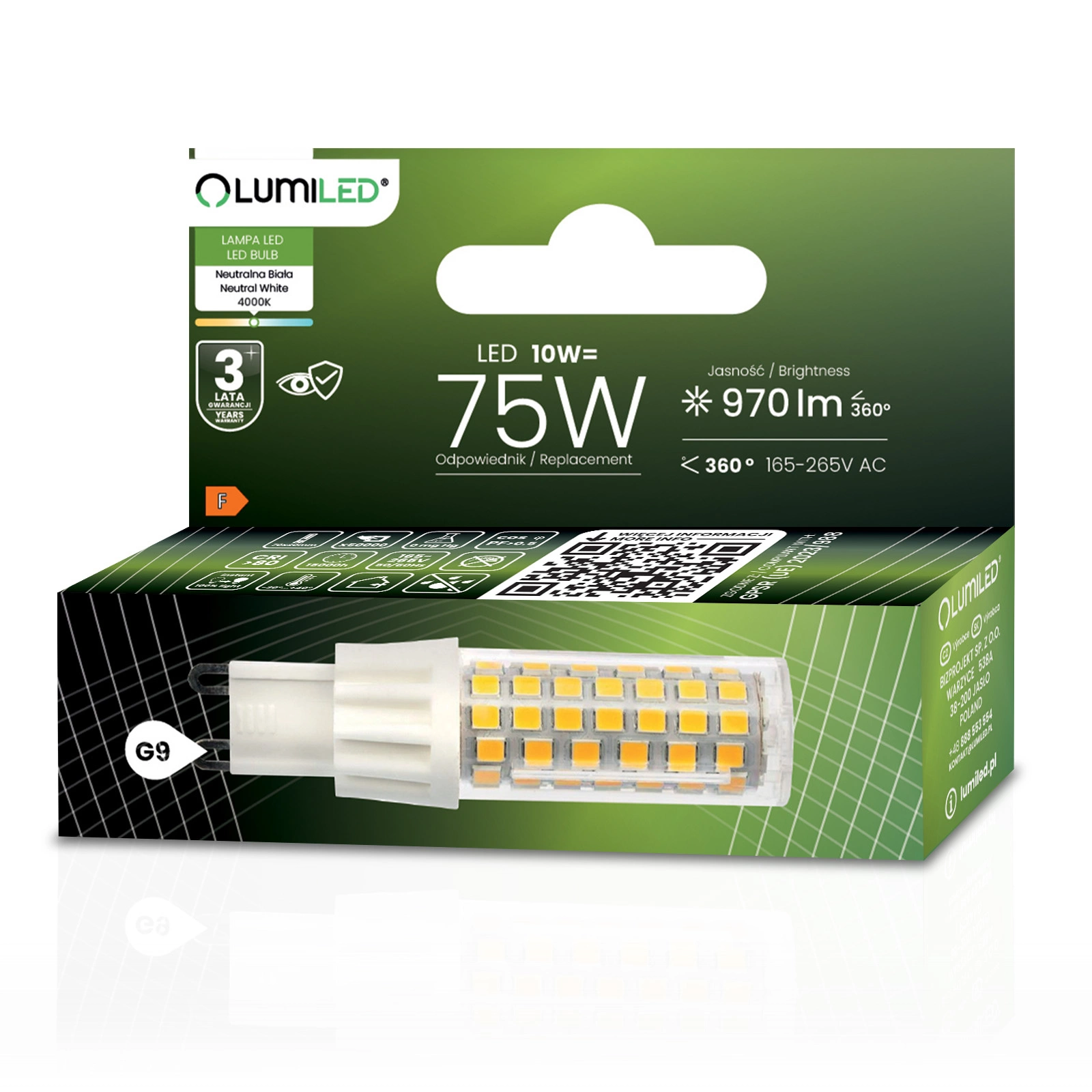 Die LED-Glühbirne der renommierten Marke LUMILED mit G9-Sockel und 10W ist ein hervorragender Ersatz für herkömmliche 75W-Glühbirnen und bietet Energieeinsparungen und eine längere Lebensdauer. Sie gibt ein Licht mit einem Lichtstrom von 970 Lumen und einer neutralen Farbe von 4000K ab und ist damit ideal für die Innenbeleuchtung, wo eine helle und natürliche Lichtfarbe gewünscht wird. Der Abstrahlwinkel von 360° ermöglicht eine breite Lichtstreuung und eine effektive Ausleuchtung des Raumes. Dank ihrer hochwertigen Konstruktion hat sie eine Lebensdauer von bis zu 15.000 Stunden, was einer langjährigen Nutzung entspricht. Darüber hinaus kann sie in einem breiten Spannungsbereich von 165-265 V betrieben werden und ist für Umgebungstemperaturen von -20°C bis +40°C geeignet. Eine ideale Wahl für alle, die Wert auf Energieeinsparung und Umweltschutz legen.