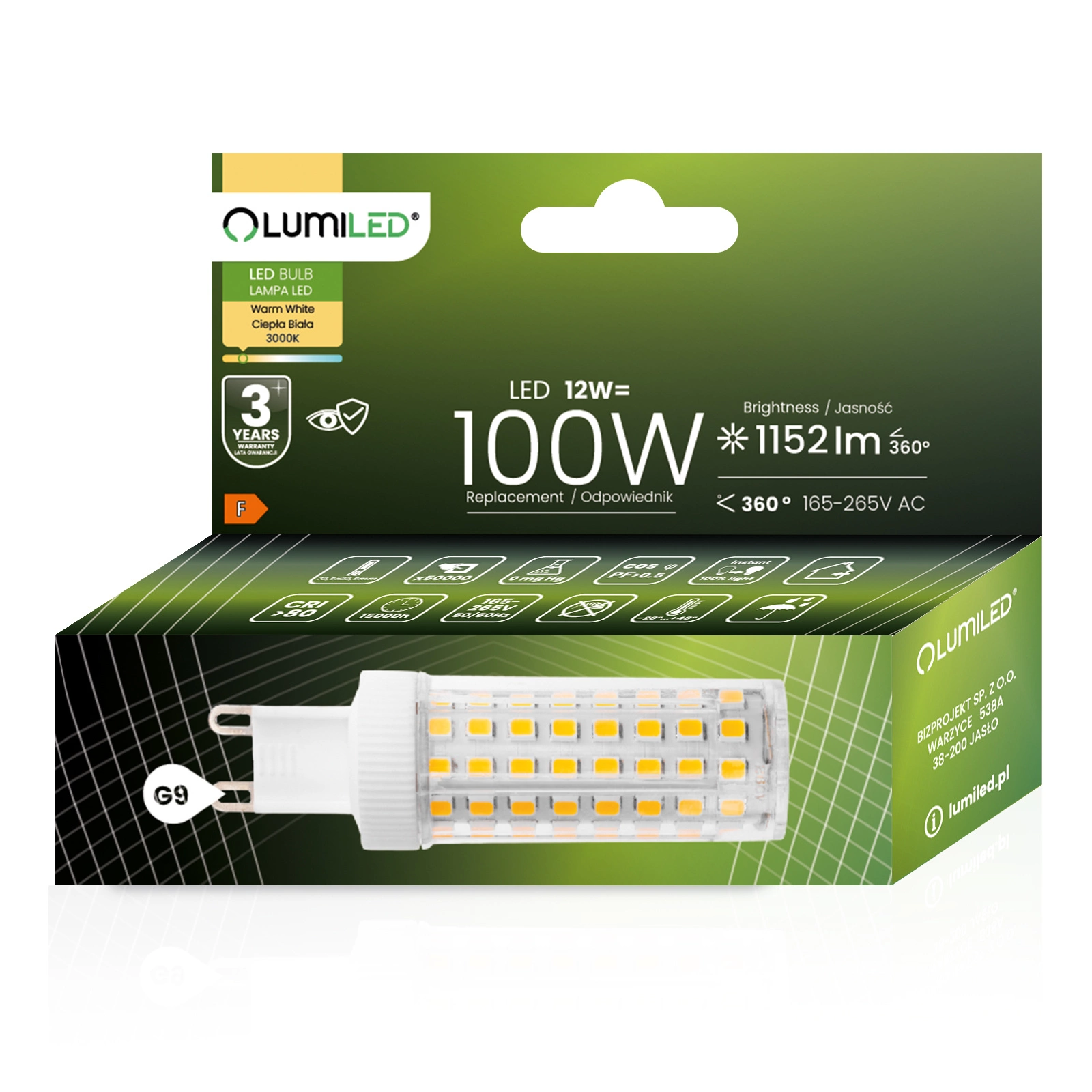 Die LED-Glühbirne der renommierten Marke LUMILED mit G9-Sockel und 12 W ist ein hervorragender Ersatz für herkömmliche 100-W-Glühbirnen und bietet Energieeinsparungen und eine längere Lebensdauer. Sie gibt ein Licht mit einem Lichtstrom von 1152 Lumen und einer warmen Lichtfarbe von 3000K ab und ist damit ideal für die Innenbeleuchtung, wo eine weiche und angenehme Lichtfarbe gewünscht wird. Der Abstrahlwinkel von 360° ermöglicht eine breite Streuung des Lichts und eine effektive Ausleuchtung des Raums. Dank ihrer hochwertigen Verarbeitung hat sie eine Lebensdauer von bis zu 15.000 Stunden, was einer langjährigen Nutzung entspricht. Zudem arbeitet sie in einem weiten Spannungsbereich von 165-265 V und ist für den Einsatz bei Umgebungstemperaturen von -20°C bis +40°C geeignet. Eine ideale Wahl für alle, die Wert auf Energieeinsparung und Umweltschutz legen.