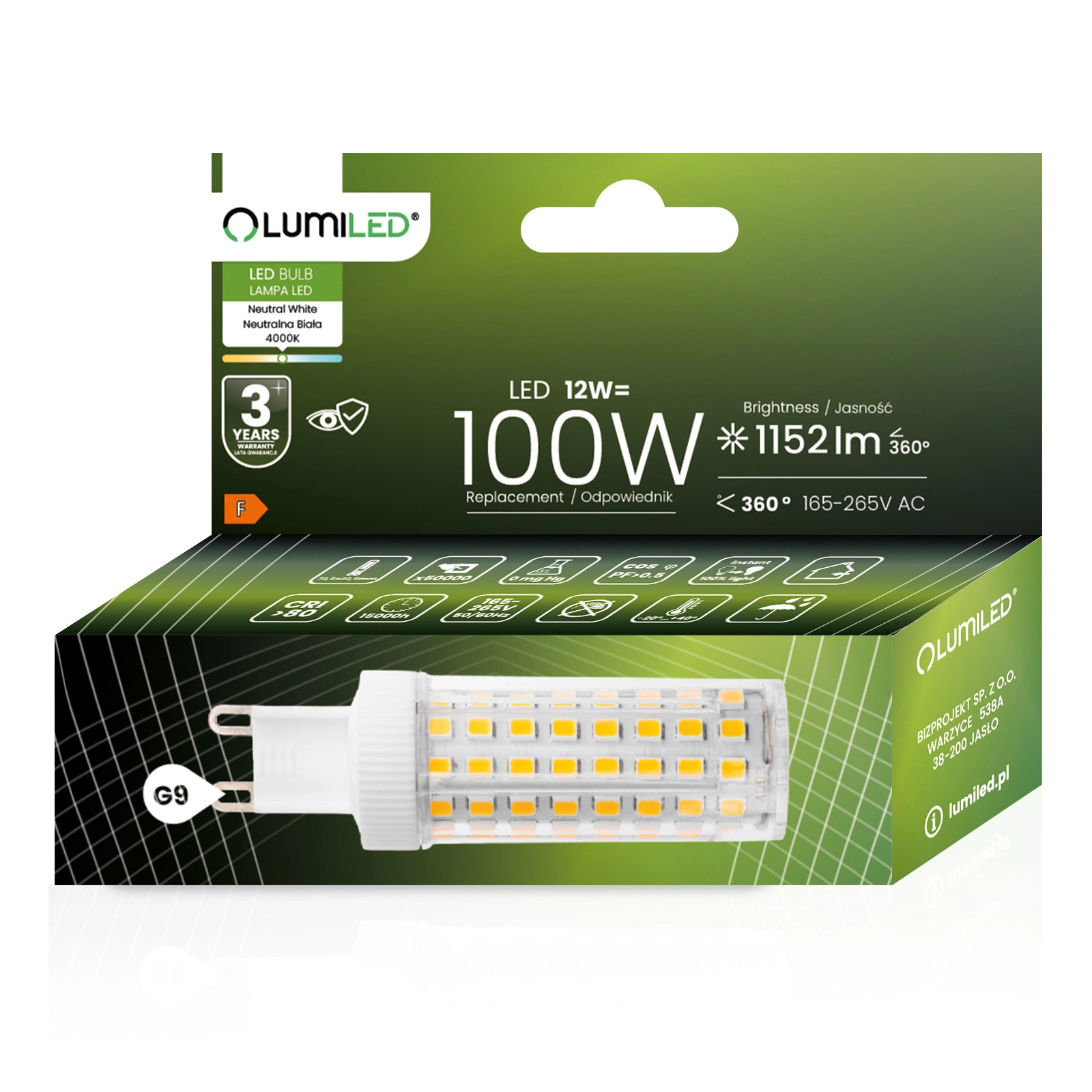 Die LED-Glühbirne der renommierten Marke LUMILED mit G9-Sockel und 12 W ist ein hervorragender Ersatz für herkömmliche 100-W-Glühbirnen und bietet Energieeinsparungen und eine längere Lebensdauer. Sie gibt ein Licht mit einem Lichtstrom von 1152 Lumen und einer neutralen Farbe von 4000K ab und ist damit ideal für die Innenbeleuchtung, wo eine helle und natürliche Lichtfarbe gewünscht wird. Der Abstrahlwinkel von 360° sorgt für eine breite Streuung des Lichts und leuchtet den Raum effektiv aus. Dank ihrer hochwertigen Konstruktion hat sie eine Lebensdauer von bis zu 15.000 Stunden, was einer langjährigen Nutzung entspricht. Darüber hinaus kann sie in einem breiten Spannungsbereich von 165-265 V betrieben werden und ist für Umgebungstemperaturen von -20°C bis +40°C geeignet. Eine ideale Wahl für alle, die Wert auf Energieeinsparung und Umweltschutz legen.