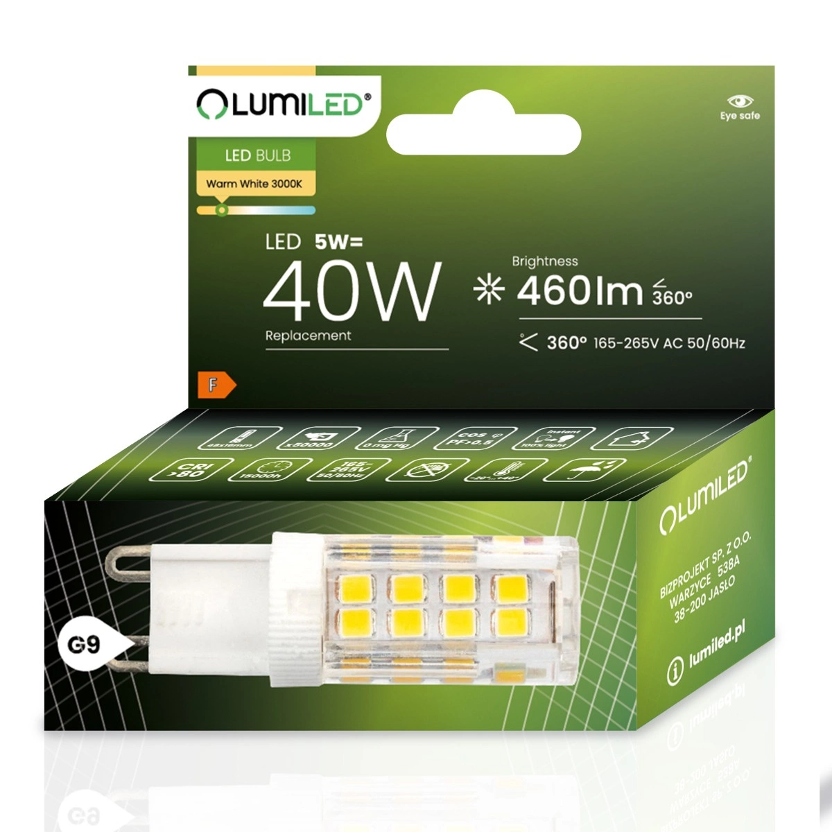 Die LED-Glühbirne der renommierten Marke LUMILED mit G9-Sockel und 5W ist ein hervorragender Ersatz für herkömmliche 40W-Glühbirnen und bietet Energieeinsparungen und eine längere Lebensdauer. Sie gibt Licht mit einem Lichtstrom von 460 Lumen und einer warmen Farbe von 3000K ab und ist damit ideal für die Innenbeleuchtung, wo eine weiche, angenehme Lichtfarbe gewünscht wird. Der Abstrahlwinkel von 360° ermöglicht eine breite Streuung des Lichts und leuchtet den Raum effektiv aus. Dank ihrer hochwertigen Verarbeitung hat sie eine Lebensdauer von bis zu 15.000 Stunden, was einer langjährigen Nutzung entspricht. Zudem arbeitet sie in einem weiten Spannungsbereich von 165-265 V und ist für den Einsatz bei Umgebungstemperaturen von -20°C bis +40°C geeignet. Eine ideale Wahl für alle, die Wert auf Energieeinsparung und Umweltschutz legen.