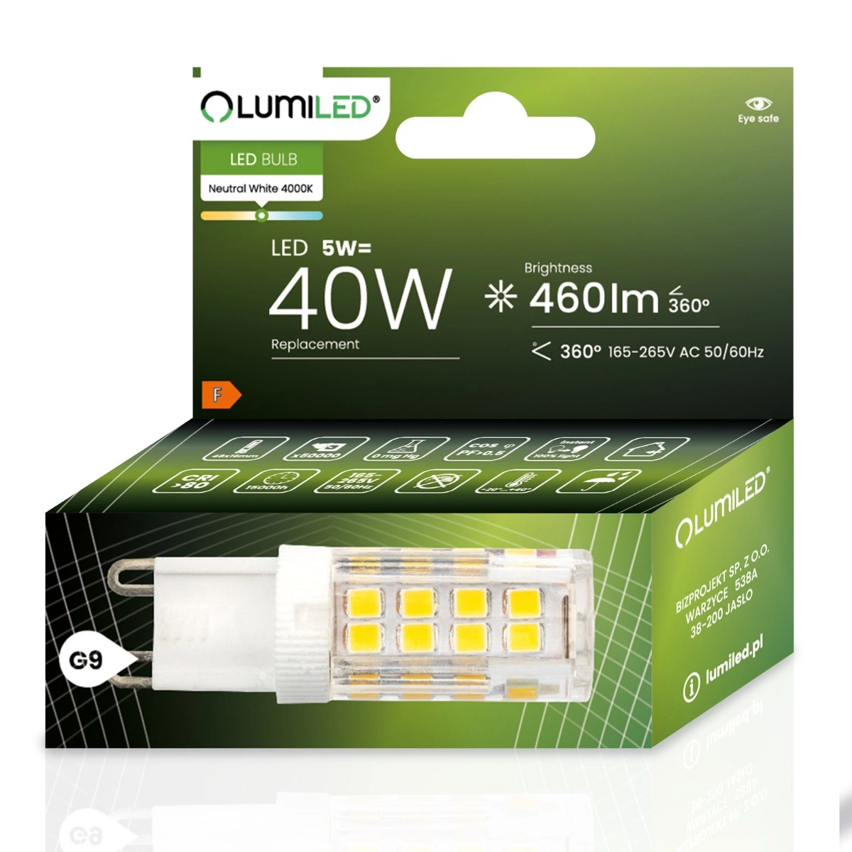 Die LED-Glühbirne der renommierten Marke LUMILED mit G9-Sockel und 5 W ist ein hervorragender Ersatz für herkömmliche 40 W-Glühbirnen und bietet Energieeinsparungen und eine längere Lebensdauer. Sie emittiert Licht mit einem Lichtstrom von 460 Lumen und einer neutralen Farbe von 4000K und ist damit ideal für die Innenbeleuchtung, wo eine helle und natürliche Lichtfarbe gewünscht wird. Der Abstrahlwinkel von 360° sorgt für eine breite Lichtstreuung und eine effektive Ausleuchtung des Raumes. Dank ihrer hochwertigen Konstruktion hat sie eine Lebensdauer von bis zu 15.000 Stunden, was einer langjährigen Nutzung entspricht. Darüber hinaus kann sie in einem breiten Spannungsbereich von 165-265 V betrieben werden und ist für Umgebungstemperaturen von -20°C bis +40°C geeignet. Eine ideale Wahl für alle, die Wert auf Energieeinsparung und Umweltschutz legen.