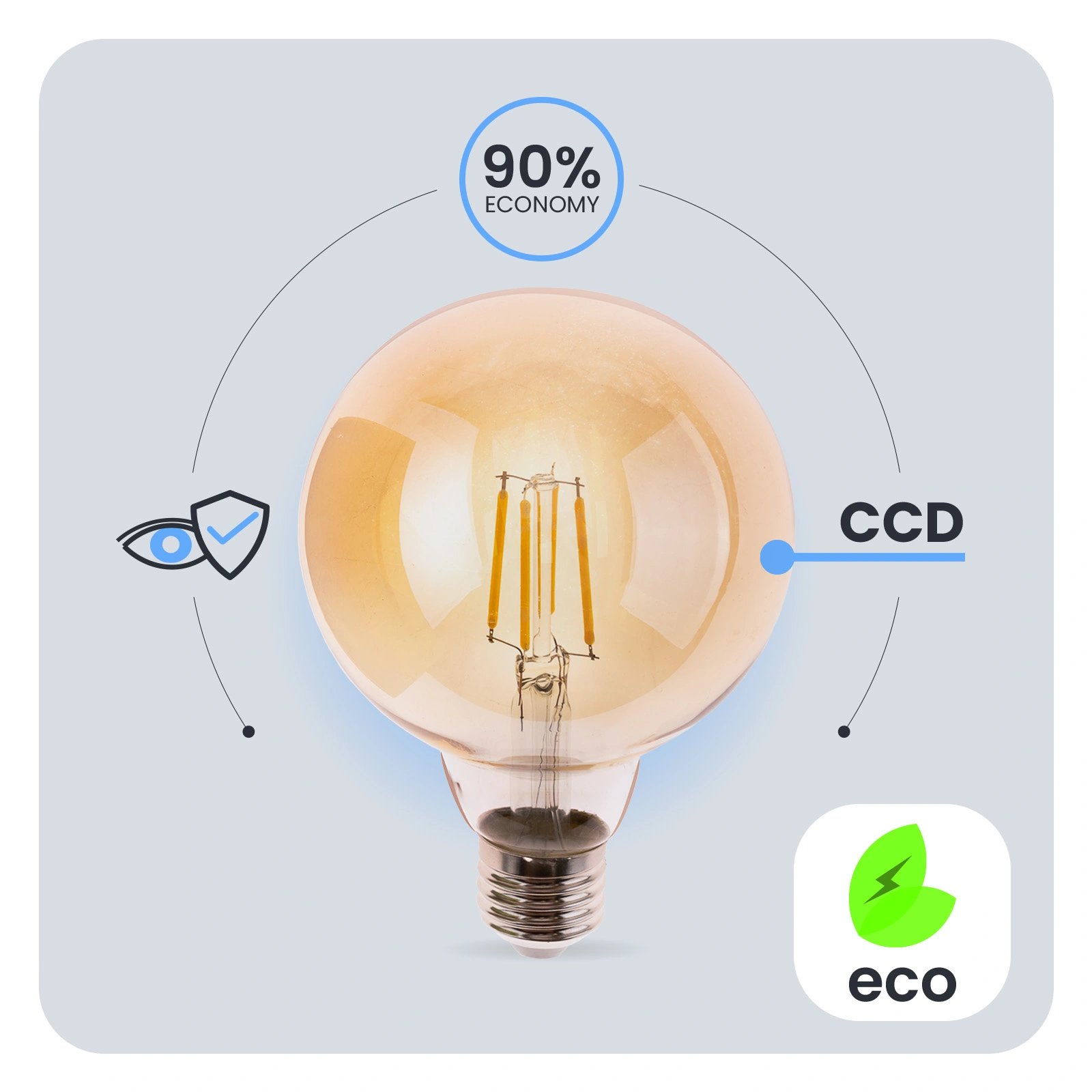 Die LED-Glühbirne G95 4W von Lumiled ist eine ausgezeichnete Wahl für alle, die eine dekorative Leuchte suchen, die eine angenehme Atmosphäre mit einem energieeffizienten Betrieb verbindet. Sie strahlt eine warme 2000K-Farbe aus und schafft eine stimmungsvolle, komfortable Atmosphäre, die ideal für Wohn- und Esszimmer, Schlafzimmer und Vintage- und Loft-Einrichtungen ist. Der E27-Sockel gewährleistet eine breite Kompatibilität mit gängigen Leuchten. Der Lichtstrom von 470 lm entspricht dem einer herkömmlichen 40-W-Glühlampe und bietet eine sanfte Helligkeit ohne Blendung. Der Abstrahlwinkel von 360° füllt den Raum gleichmäßig mit Licht und unterstreicht den dekorativen Charakter der Einrichtung. Die ideale Glühlampe für alle, die Wert auf Ästhetik und subtile Lichtakzente im Alltag legen.