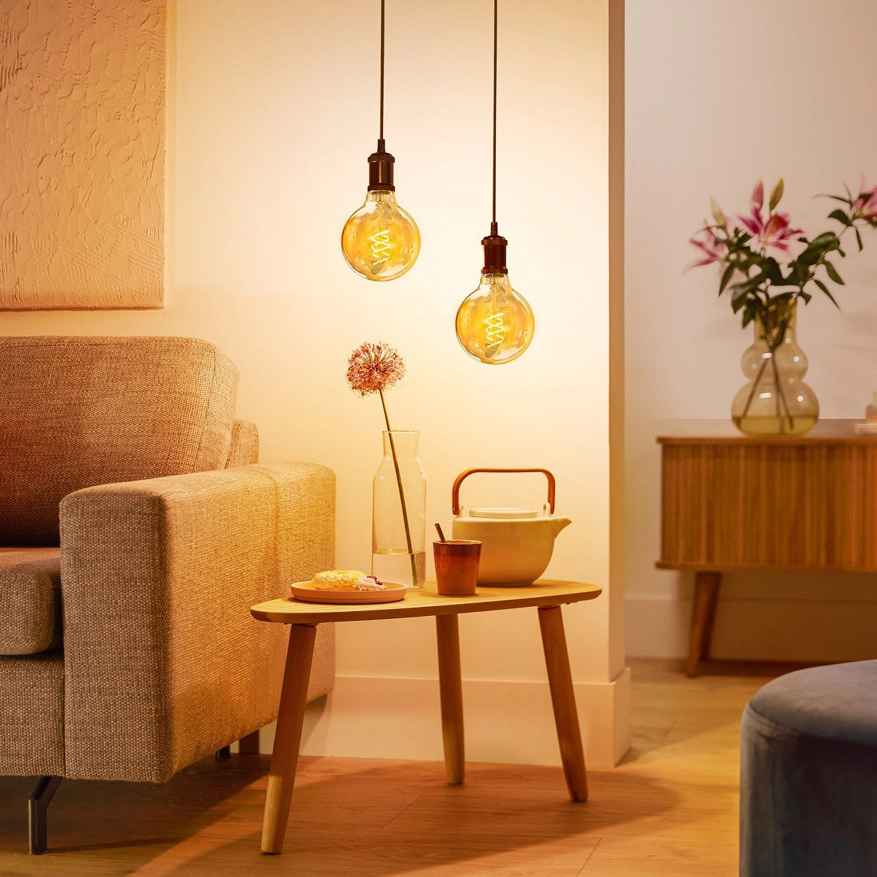 Die 7W LED-Glühbirne mit großem Leuchtmittel mit bernsteinfarbenem Glas und E27-Sockel von PHILIPS erstrahlt mit gleichmäßigem Licht, das für einen wunderbaren Ausblick in Ihrem Zuhause sorgt und eine entspannende, warme Atmosphäre schafft. Der CRI (Farbwiedergabeindex) liegt über 80, was für ein lebendigeres und natürlicheres Licht sorgt. Der Vorteil von LED-Lampen liegt in der Vielfalt der Lichtfarben, die es uns ermöglicht, den Raum an unsere Bedürfnisse anzupassen.