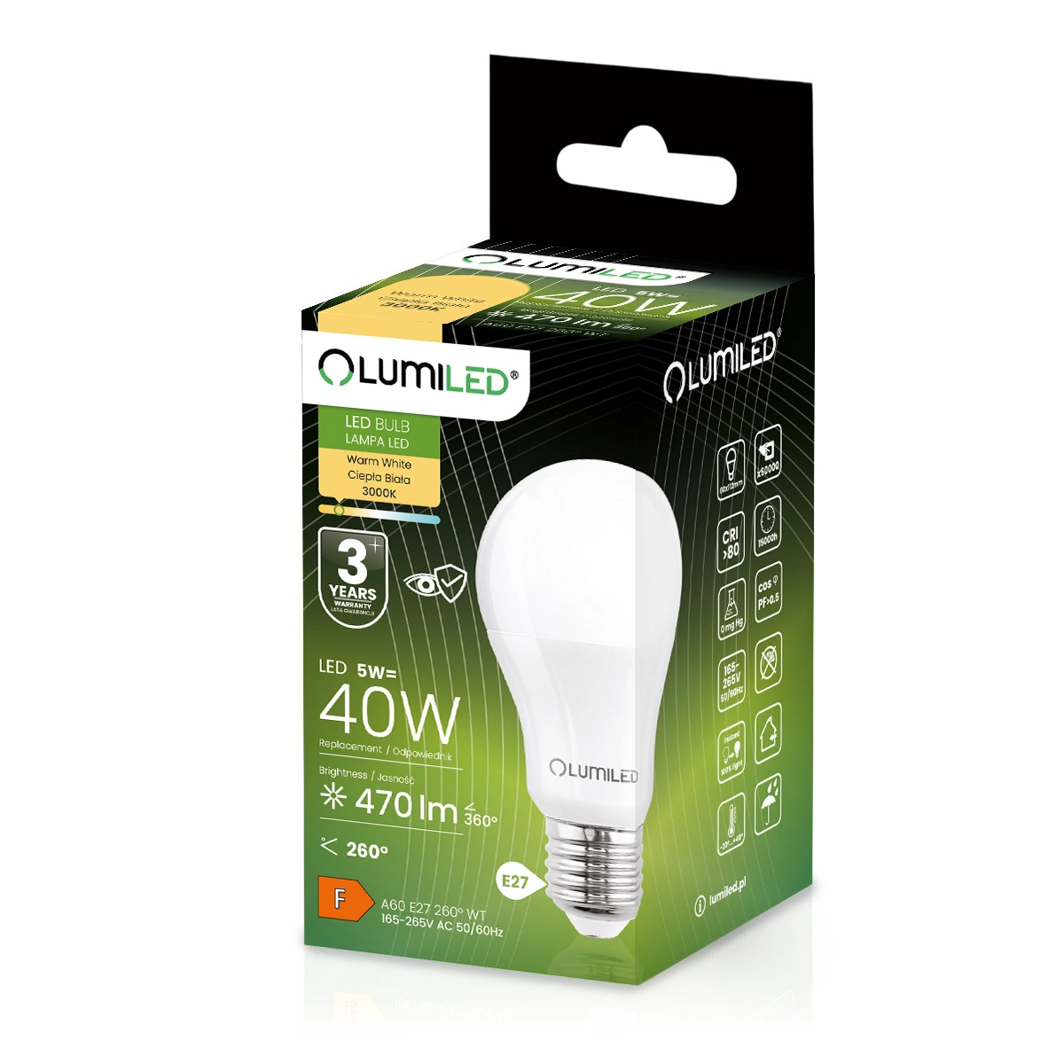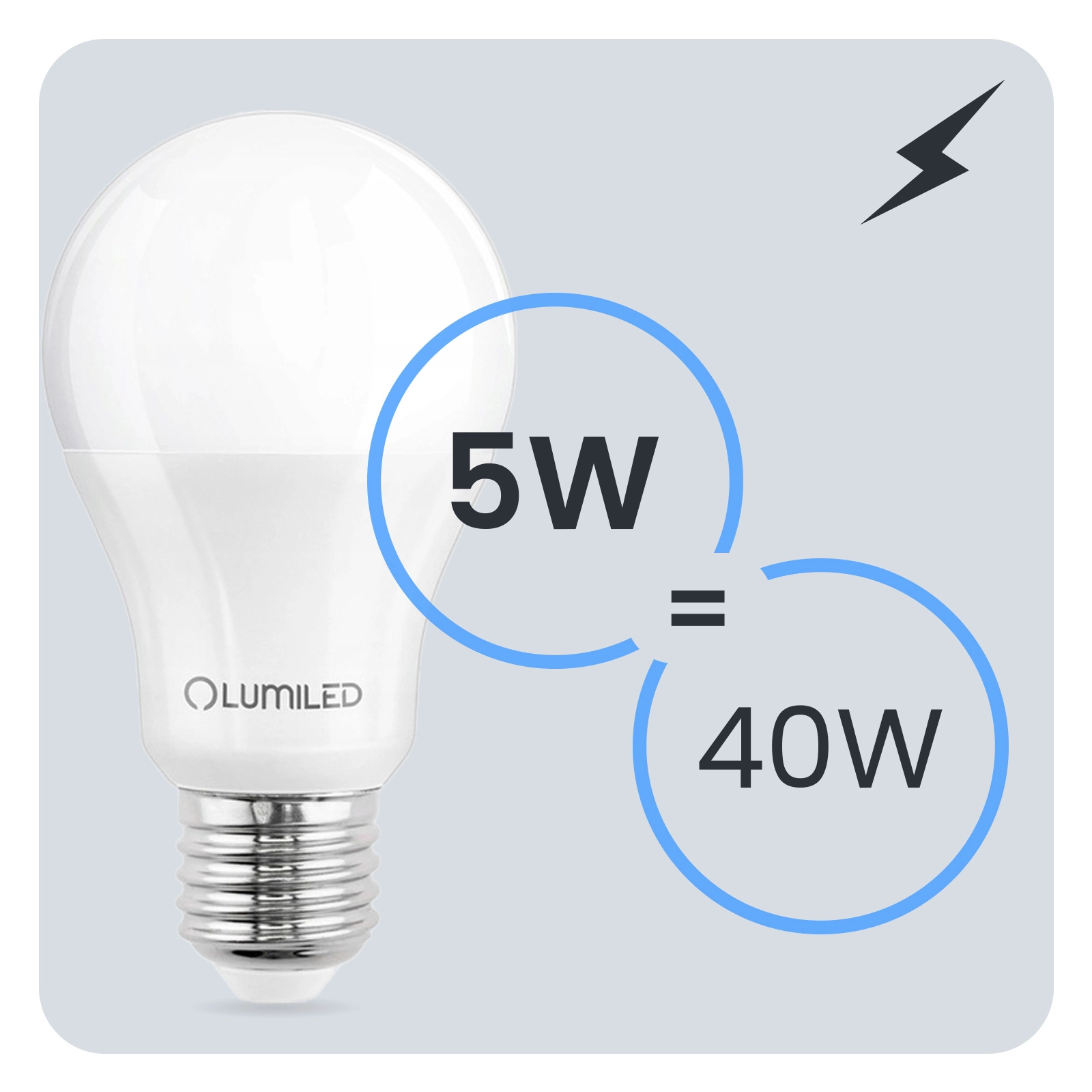 Die LED-Glühbirne der renommierten Marke LUMILED mit E27-Sockel und 5W ist ein hervorragender Ersatz für herkömmliche 40W-Glühbirnen und bietet Energieeinsparungen und eine längere Lebensdauer. Sie gibt Licht mit einem Lichtstrom von 470 Lumen und einer warmen Farbe von 3000K ab und ist damit ideal für die Innenbeleuchtung, wo eine weiche, angenehme Lichtfarbe gewünscht wird. Der Abstrahlwinkel von 260° ermöglicht eine breite Streuung des Lichts und leuchtet den Raum effektiv aus. Dank ihrer hochwertigen Verarbeitung hat sie eine Lebensdauer von bis zu 15.000 Stunden, was einer langjährigen Nutzung entspricht. Außerdem arbeitet sie in einem weiten Spannungsbereich von 165-265 V und ist für den Einsatz bei Umgebungstemperaturen von -20°C bis +40°C geeignet. Eine ideale Wahl für alle, die Wert auf Energieeinsparung und Umweltschutz legen.