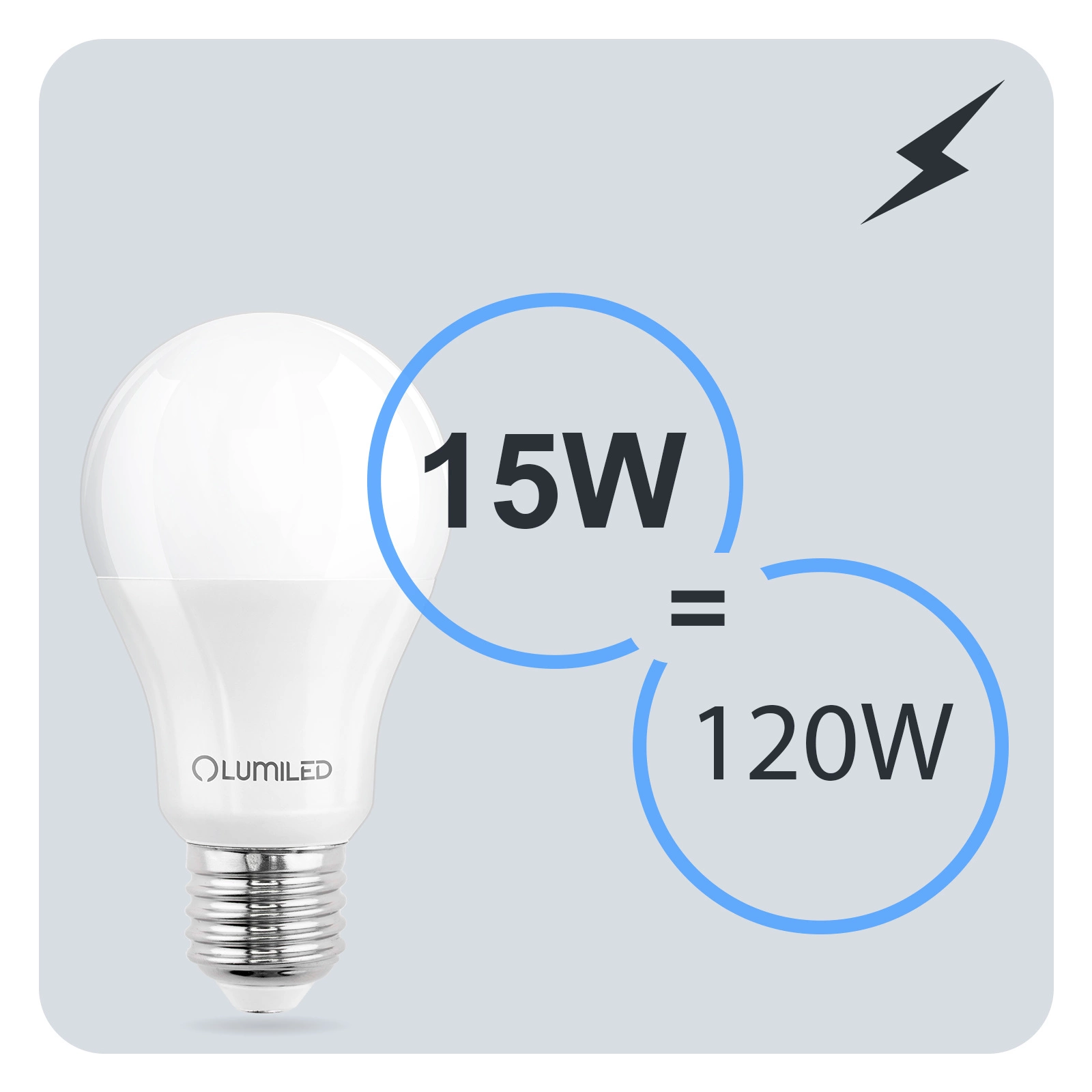 Die LED-Glühbirne der renommierten Marke LUMILED mit E27-Sockel und 15W ist ein hervorragender Ersatz für herkömmliche 120W-Glühbirnen und bietet Energieeinsparungen und eine längere Lebensdauer. Sie emittiert Licht mit einem Lichtstrom von 1.952 Lumen und einer neutralen Farbe von 4000K und ist damit ideal für die Innenbeleuchtung, wo eine helle und natürliche Lichtfarbe gewünscht wird. Der Abstrahlwinkel von 260° ermöglicht eine breite Lichtstreuung, die den Raum effektiv ausleuchtet. Dank ihrer hochwertigen Verarbeitung hat sie eine Lebensdauer von bis zu 15.000 Stunden, was einer langjährigen Nutzung entspricht. Außerdem arbeitet sie in einem weiten Spannungsbereich von 165-265 V und ist für den Einsatz bei Umgebungstemperaturen von -20°C bis +40°C geeignet. Eine ideale Wahl für alle, die Wert auf Energieeinsparung und Umweltschutz legen.