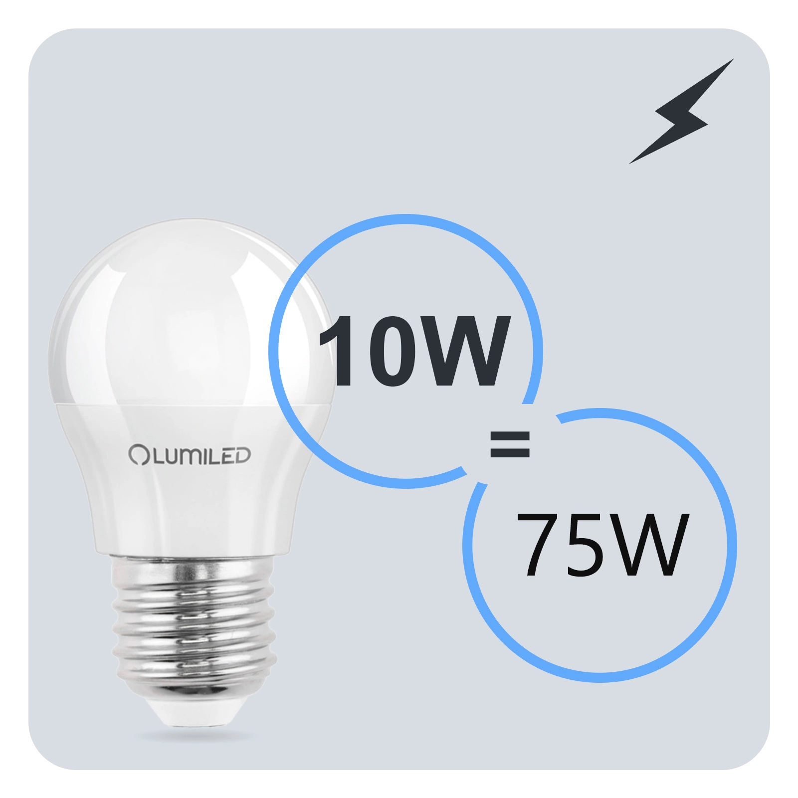 Die LED-Glühbirne der renommierten Marke LUMILED mit E27-Sockel und 10W ist ein hervorragender Ersatz für traditionelle 75W-Glühbirnen und bietet Energieeinsparungen und eine längere Lebensdauer. Sie emittiert Licht mit einem Lichtstrom von 1055 Lumen und einer kalten Lichtfarbe von 6500K und ist somit ideal für die Innenbeleuchtung, wo eine starke weiße Lichtfarbe benötigt wird. Der Lichtwinkel von 180° ermöglicht eine breite Streuung des Lichts und leuchtet den Raum effektiv aus. Dank ihrer hochwertigen Konstruktion hat sie eine Lebensdauer von bis zu 15.000 Stunden, was einer langjährigen Nutzung entspricht. Darüber hinaus kann sie in einem breiten Spannungsbereich von 165-265 V betrieben werden und ist für Umgebungstemperaturen von -20°C bis +40°C geeignet. Eine ideale Wahl für alle, die Wert auf Energieeinsparung und Umweltschutz legen.