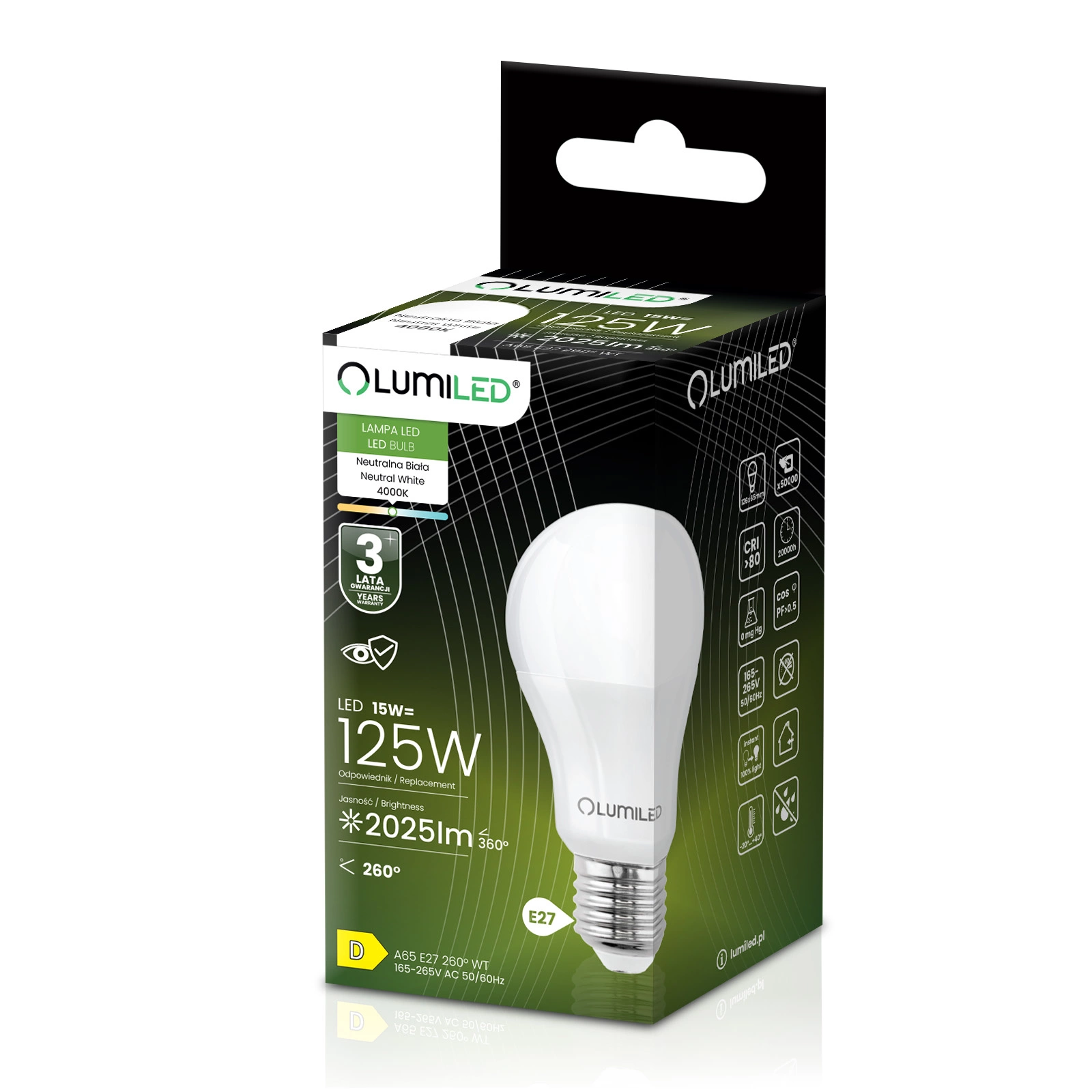 Die LED-Glühbirne der renommierten Marke LUMILED mit E27-Sockel und 15W ist ein hervorragender Ersatz für herkömmliche 120W-Glühbirnen und bietet Energieeinsparungen und eine längere Lebensdauer. Sie emittiert Licht mit einem Lichtstrom von 1.952 Lumen und einer neutralen Farbe von 4000K und ist damit ideal für die Innenbeleuchtung, wo eine helle und natürliche Lichtfarbe gewünscht wird. Der Abstrahlwinkel von 260° ermöglicht eine breite Lichtstreuung, die den Raum effektiv ausleuchtet. Dank ihrer hochwertigen Verarbeitung hat sie eine Lebensdauer von bis zu 15.000 Stunden, was einer langjährigen Nutzung entspricht. Außerdem arbeitet sie in einem weiten Spannungsbereich von 165-265 V und ist für den Einsatz bei Umgebungstemperaturen von -20°C bis +40°C geeignet. Eine ideale Wahl für alle, die Wert auf Energieeinsparung und Umweltschutz legen.